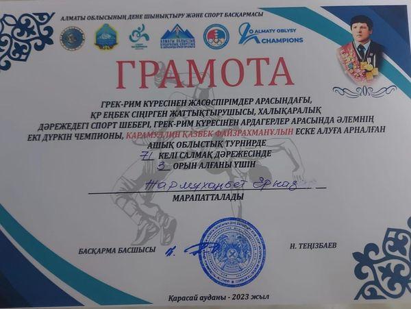 ҚР еңбек сіңірген жаттықтырушысы, Халықаралық дәрежедегі спорт шебері, грек-рим күресінен ардагерлер арасында әлемнің екі дүркін чемпионы, Карамуллин Қазбек Файзрахманұлын еске алуға арналған грек-рим күресінен жасөспірімдер арасындағы ашық облыстық турнирде 71 келі салмақ дәрежесінде 3-орын алғаны үшін N178 мамандандырылған лицейдің 10 "Ж" сынып оқушысы Жармуханбет Ерназ грамота мен марапатталды.