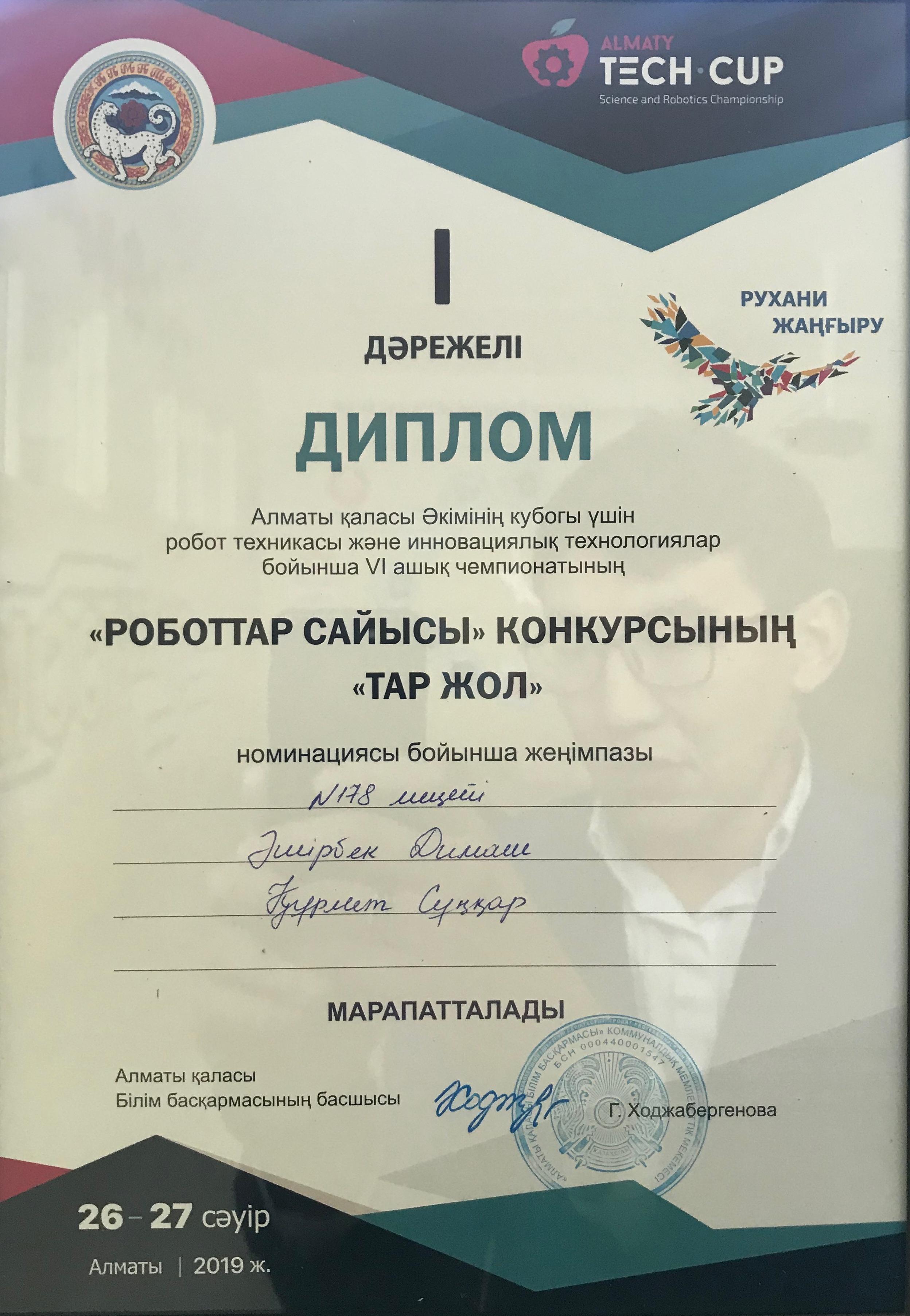Алматы қаласы Әкімінің кубогы үшін робот техникасы және инновациялық технологиялар бойынша VI ашық чемпионатының «РОБОТТАР САЙЫСЫ» конкурсының «ТАР ЖОЛ» номинациясы бойынша жеңімпазы №178 лицей оқушылары Әмірбек Димаш және Құрмет Сұңқар І дәрежелі дипломмен марапптатталды.