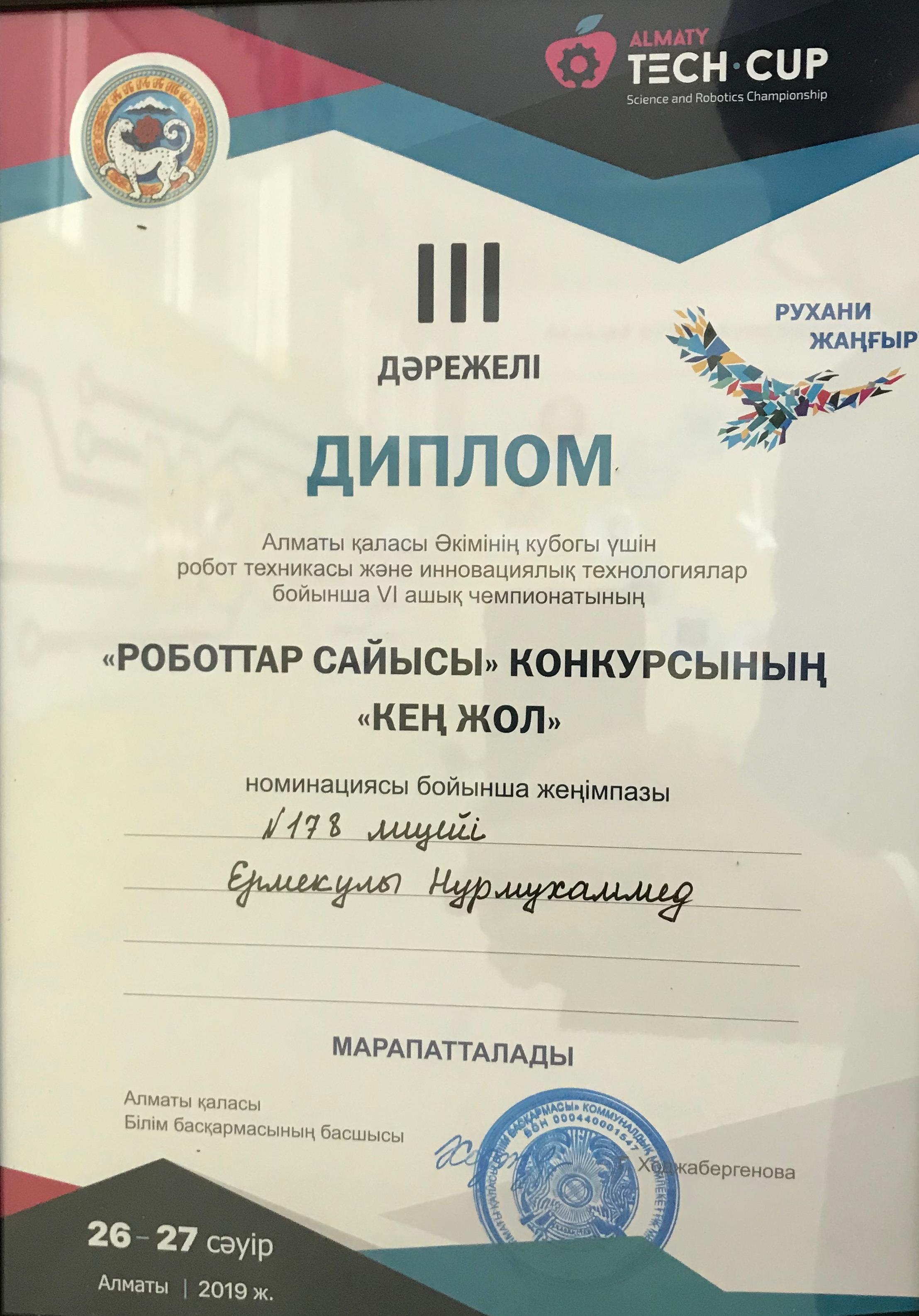 26-27 сәуір аралығында Алматы қаласы Әкімінің кубогы үшін робот техникасы және инновациялық технологиялар бойынша VI ашық чемпионатының «РОБОТТАР САЙЫСЫ» конкурсының «КЕҢ ЖОЛ» номинациясы бойынша жеңімпазы №178 лицей оқушысы Ермекұлы Нұрмухаммед ІІІ дәрежелі дипломмен марапптатталды.