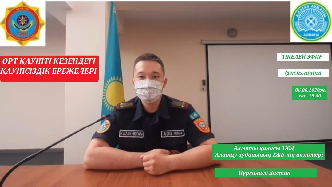 Карантин кезінде мектепте қашықтықтан оқыту - бұл коронавирустық инфекцияның таралуына және қалада ТЖ режимін енгізуге байланысты Үкімет қабылдаған мәжбүрлі шара. Алатау ауданының төтенше жағдайлар бөлімінің қызметкерлері өсіп келе жатқан ұрпақты (балаларды) тәрбиелеу үшін қауіпсіздік мәдениетіне келесі тақырыптарға бейнесабақтар (орыс және мемлекеттік тілде) дайындады: