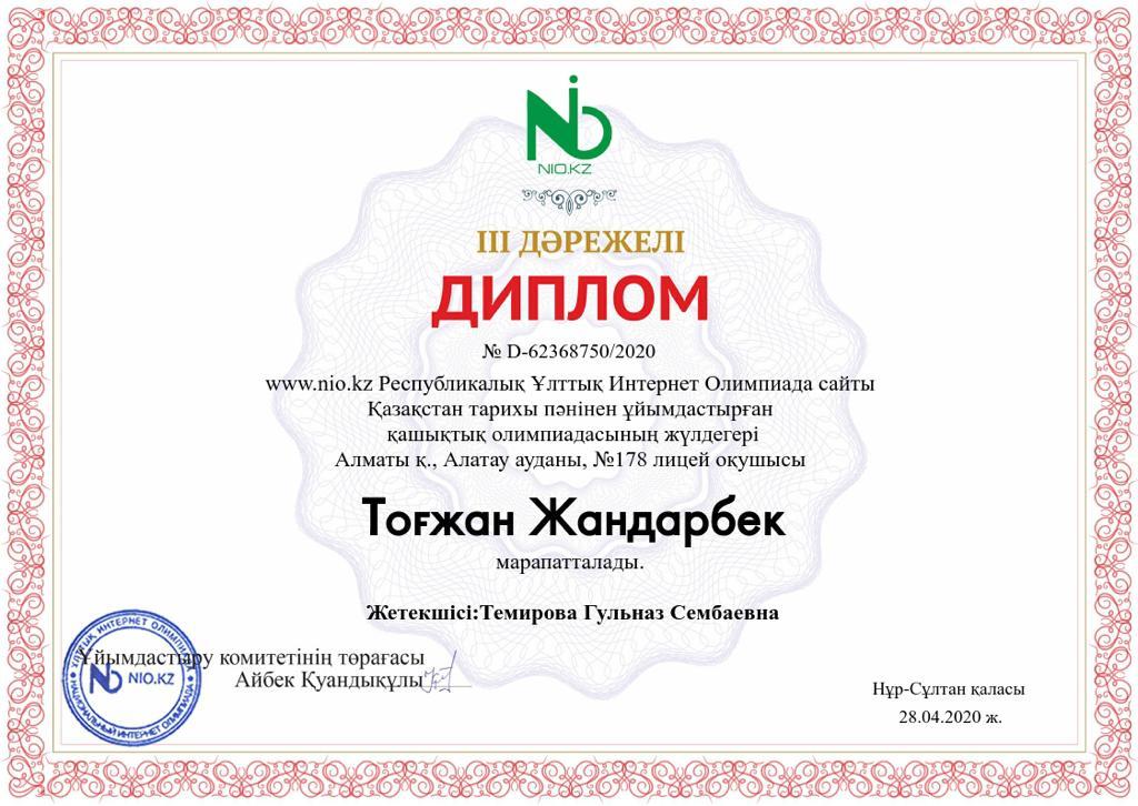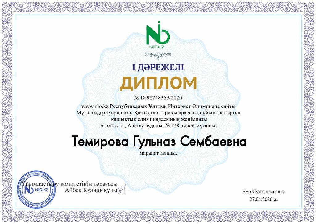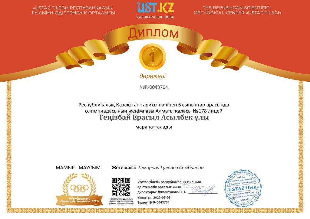 Қашықтықтан Республикалық Дәстүрлі Интернет және Ұлттық Интернет Олимпиада сайттары ұйымдастырған Қазақстан тарихы пәні бойынша өткізілген олимпиадаға лицейіміздің оқушылары мен мұғалімдері қатысып, І және ІІ дәрежелі дипломдарымен марапатталды.