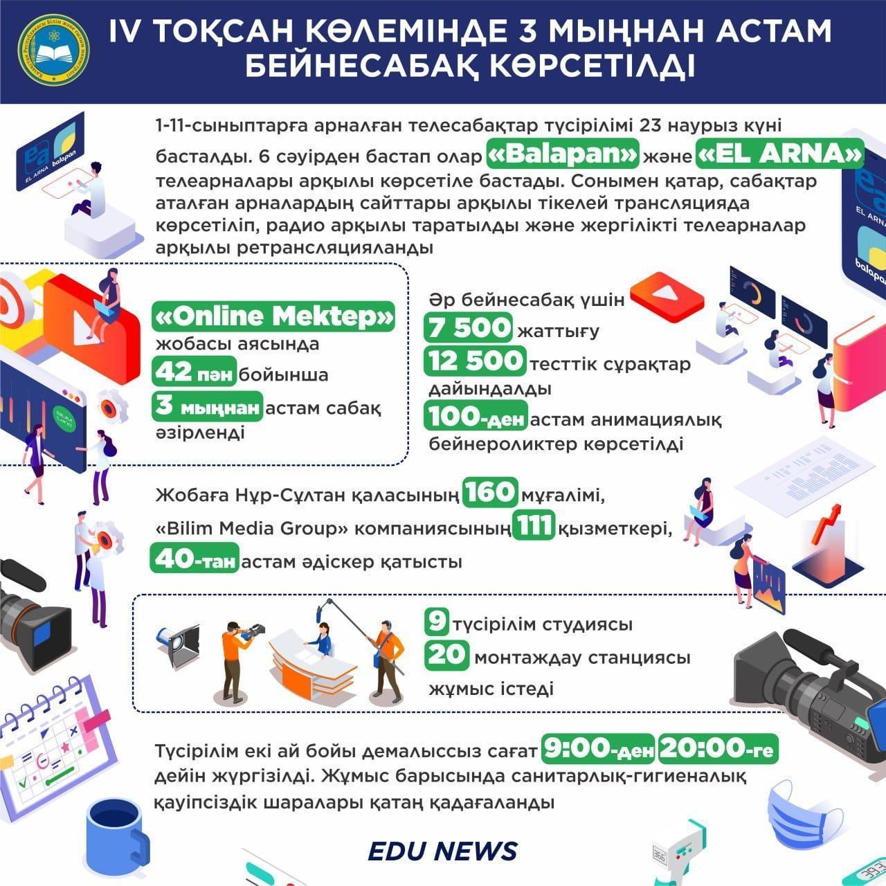 🎬 1-11-сыныптарға арналған телесабақтар түсірілімі 23 наурыз күні басталды. 6 сәуірден бастап олар «Balapan» және «EL ARNA» телеарналары арқылы көрсетіле бастады. Сонымен қатар, сабақтар аталған арналардың сайттары арқылы тікелей трансляцияда көрсетіліп, радио арқылы таратылды және жергілікті телеарналар арқылы ретрансляцияланды.