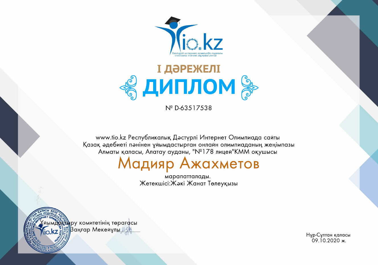 09 октябрь 2020 0 1 2 3 4 5 Республикалық дәстүрлі интернет олимпиадасы №178 лицей оқушысы Ажахметов Мадияр Республикалық дәстүрлі интернет олимпиада сайты Қазақ әдебиеті пәнінен ұйымдастырған онлайн олимпиадаға қатысып, І дәрежелі дипломдармен марапатталды.Жетекші пән мұғалімі: Жәкі Жанат Төлеуқызы Осы беттің QR-коды:QR-код этой страницы: