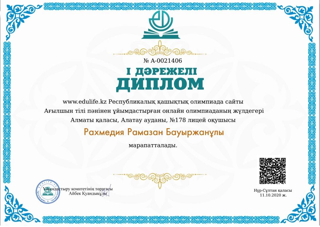 Edulife.kz Республикалық қашықтық олимпиада сайты ағылшын тілі пәнінен ұйымдастырған онлайн олимпиадаға қатысқан №178 лицей оқушылары І дәрежелі дипломдармен марапатталды. Жетекшісі: Ауелбекова Айнұр