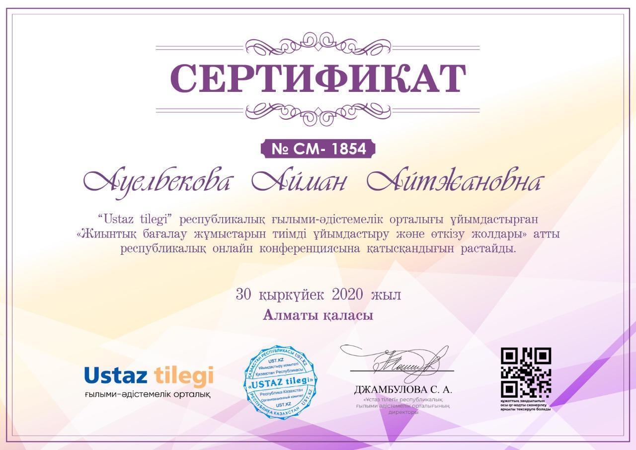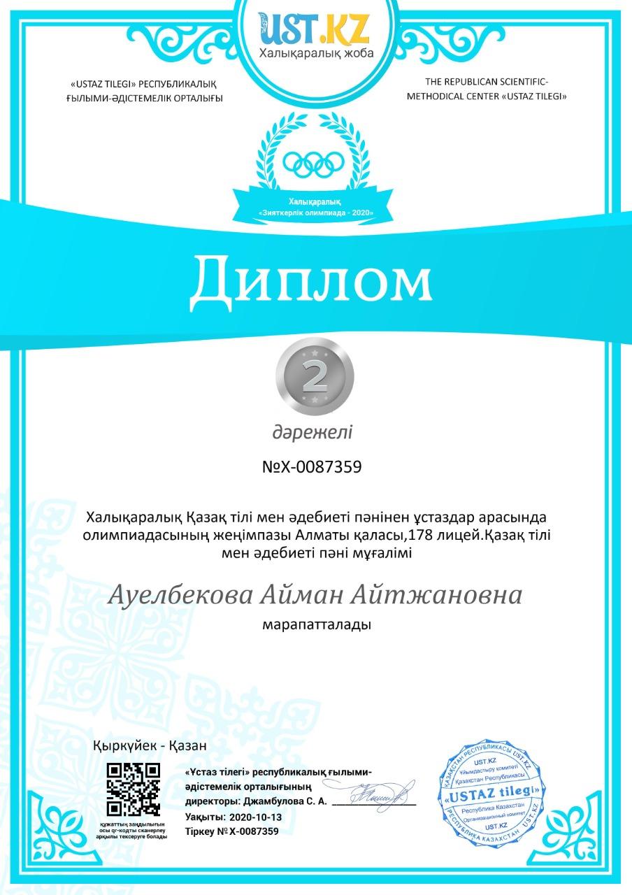№178 лицейдің қазақ тілі мен әдебиеті пәнінің мұғалімі Ауелбекова Айман Айтжанқызының үнемі ізденіс үстінде жүріп, шығармашылықпен жұмыс жасайтындығының дәлелі Республикалық "Ұстаз тілегі" ғылыми-әдістемелік орталығы ұйымдастырған олимпиада жеңімпазы болуы.
