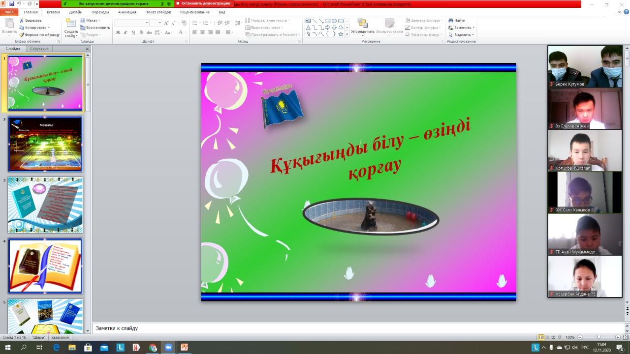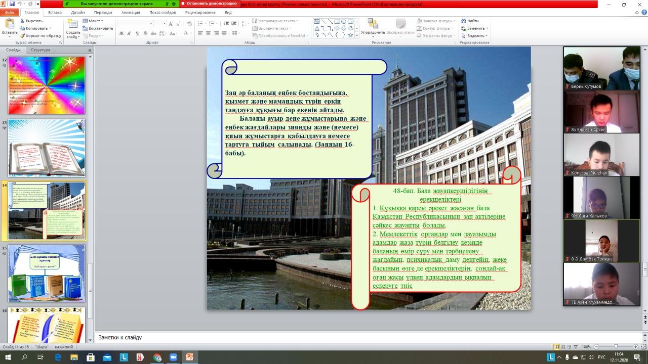 №178 лицей оқушылары арасында құқық бұзушылықтың алдын алу бағытында директордың тәрбие ісі жөніндегі орынбасарларының ұйымдастыруымен "Құқығыңды білу – өзіңді қорғау" атты Алатау АПБ ЖПКБ ЮПБ ага лейтенант полициясы А.Б Бапановпен онлайн кездесу өткізілді.