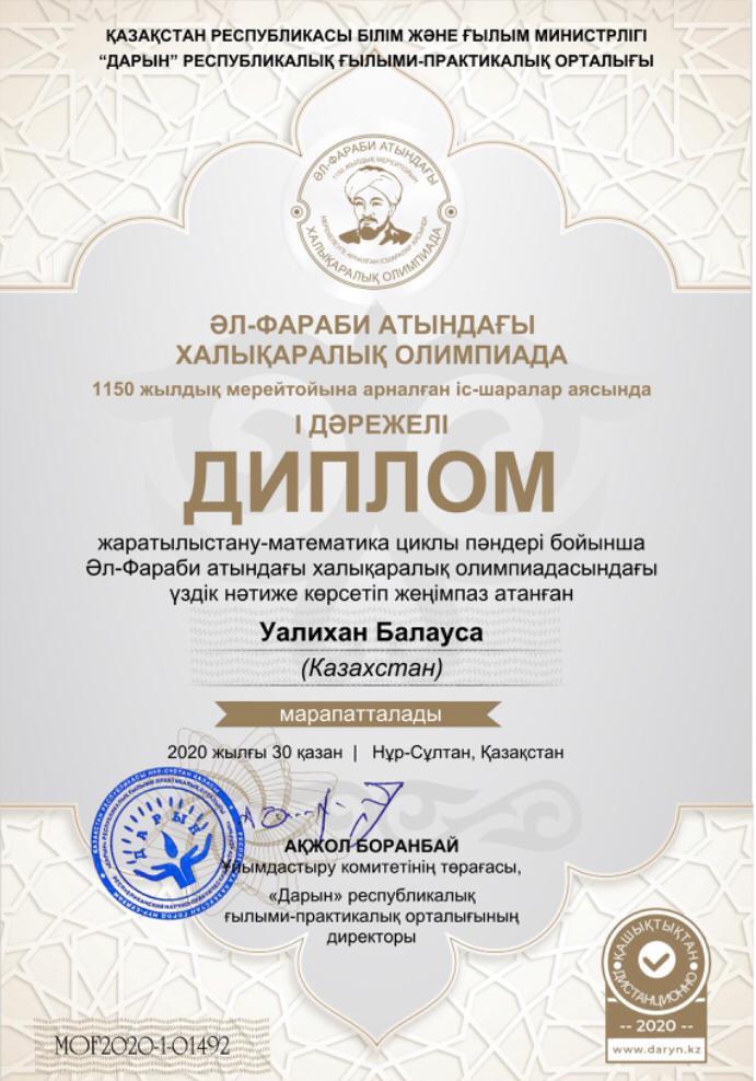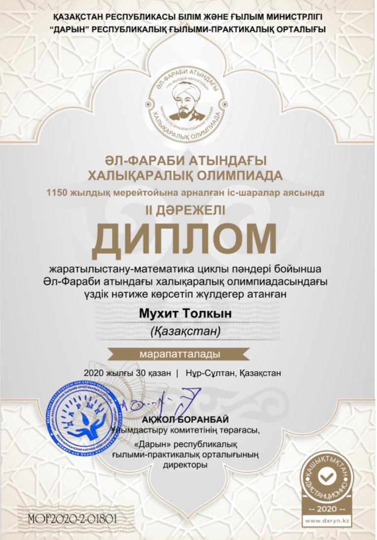 Ұлы ғалым, философ, ойшыл Әбу Насыр Әл-Фарабидің 1150 жылдығын мерекелеу аясында жаратылыстану-математика циклы пәндері бойынша Әл-Фараби атындағы халықаралық олимпиада өткізілді. Олимпиаданы ұйымдастырған Қазақстан Республикасы Білім және ғылым министрлігінің «Дарын» республикалық ғылыми-практикалық орталығы. Олимпиаданың негізгі мақсаттары мен міндеттері – дарынды балалар мен талантты жастарды анықтау, оқу пәндеріне қызығушылықтарын, оқушылардың шығармашылық белсенділігін дамыту, олардың мәдени диапозын кеңейту, сабақтан тыс жұмыстарды жандандыру, қатысушыларға өз білімдері мен дағдыларын балама бағалауға мүмкіндіктер беру. №178 лицейдің 10 сынып оқушылары олимпиадаға қатысып, физика, химия, биология, география пәндері бойынша 45 оқушы жүлделі орындарға ие болды. Марапаттарыңыз құтты болсын!