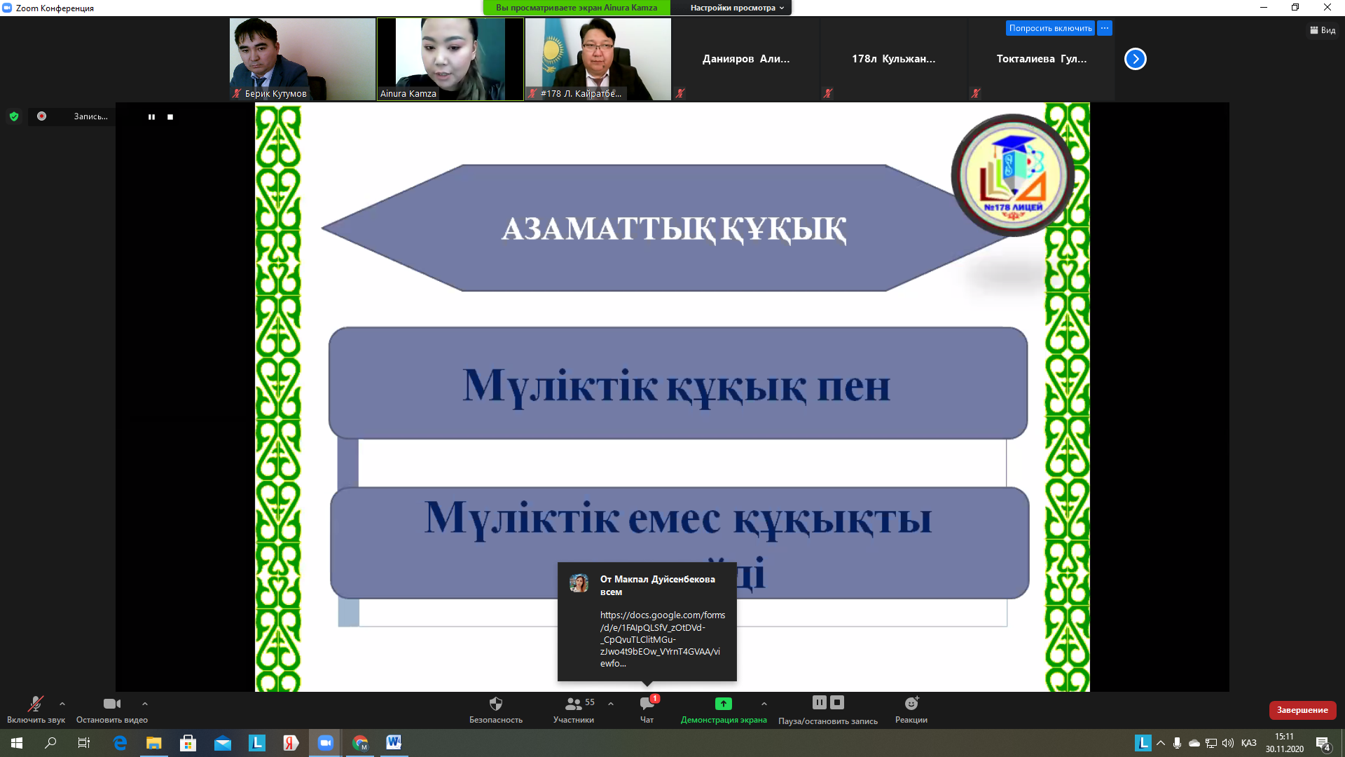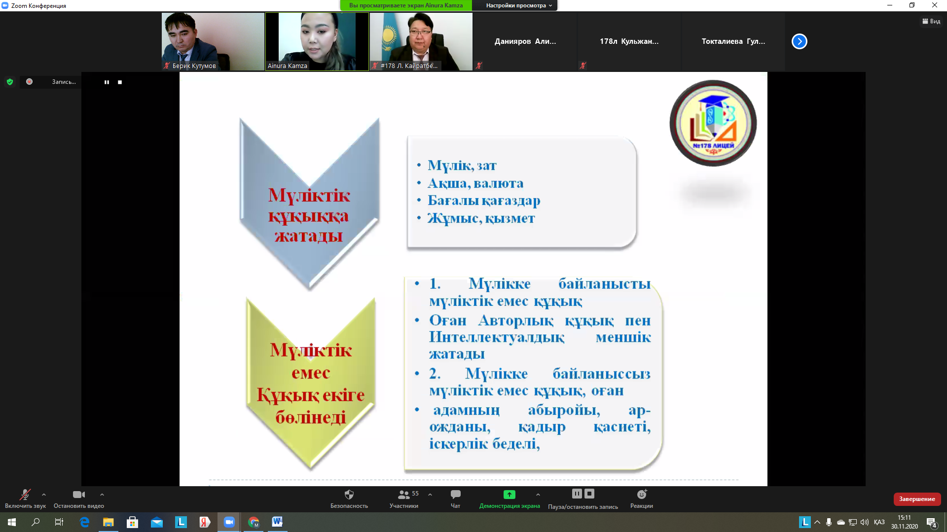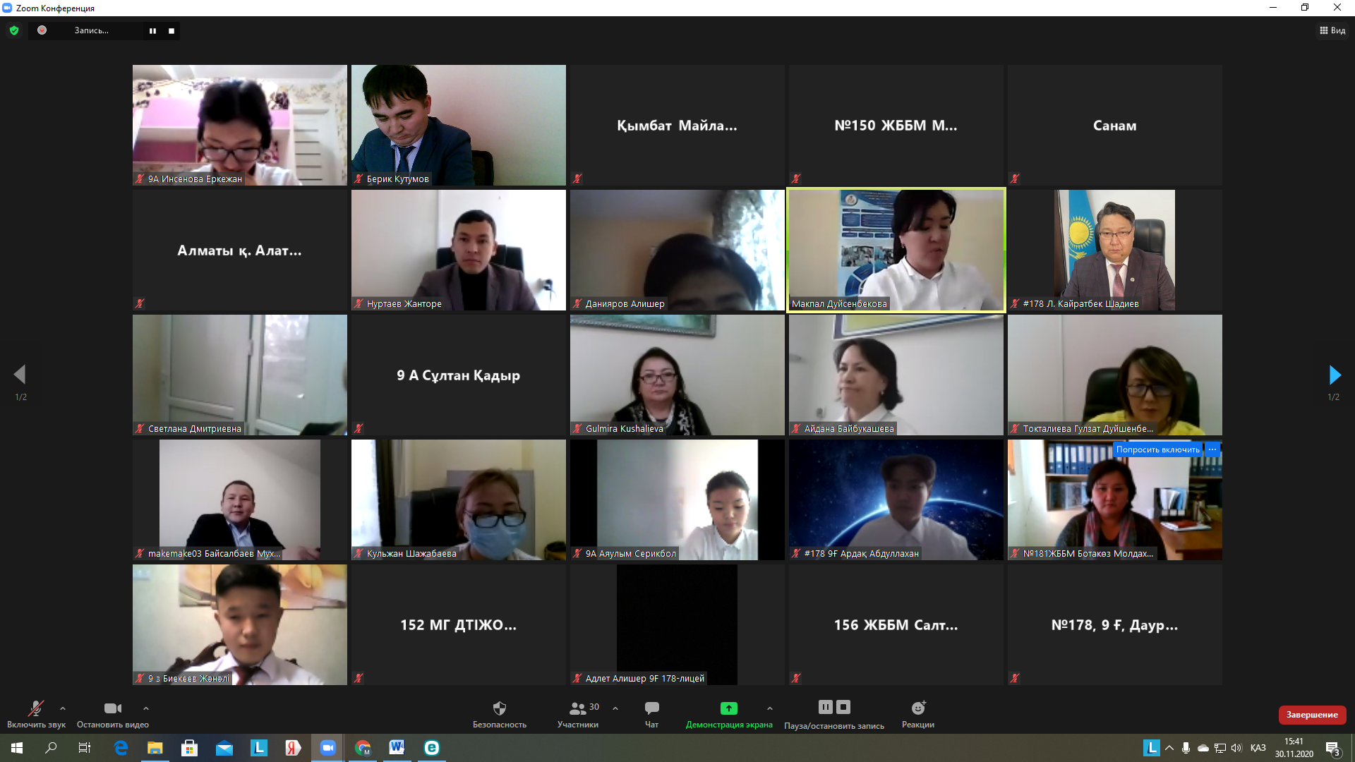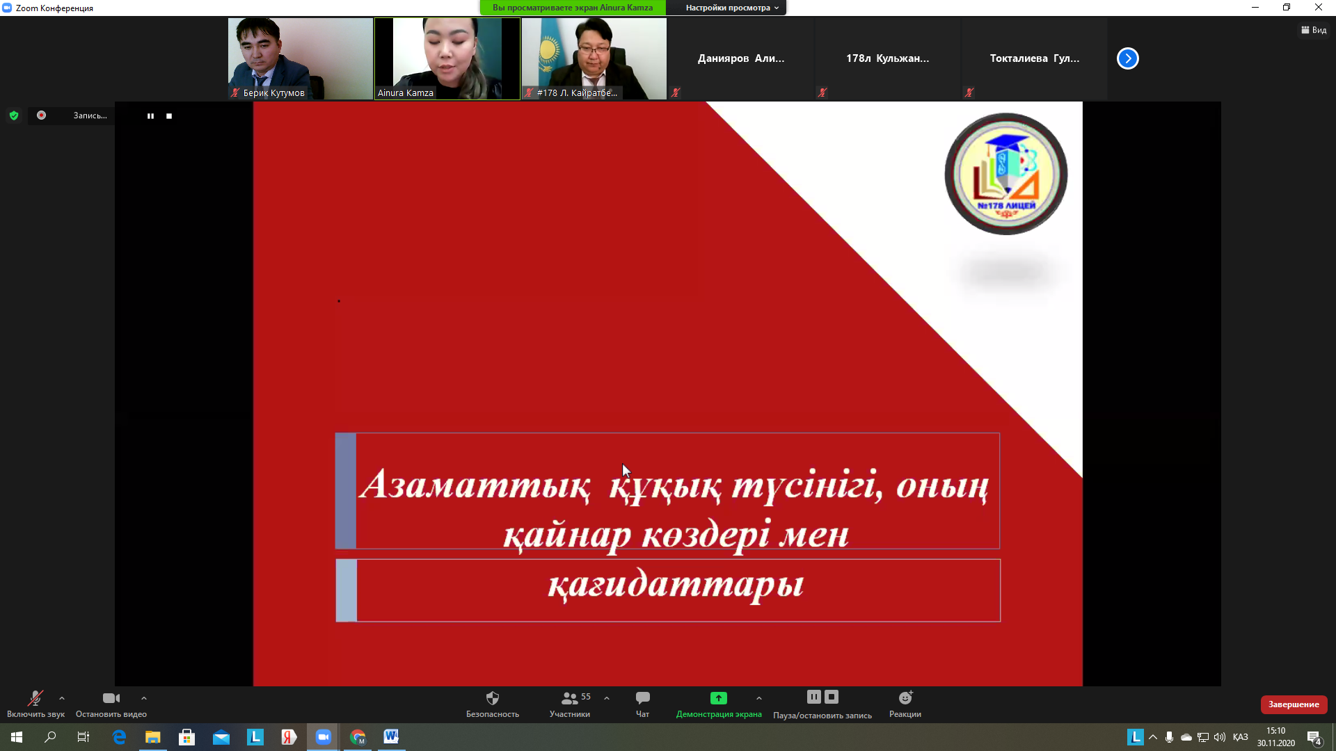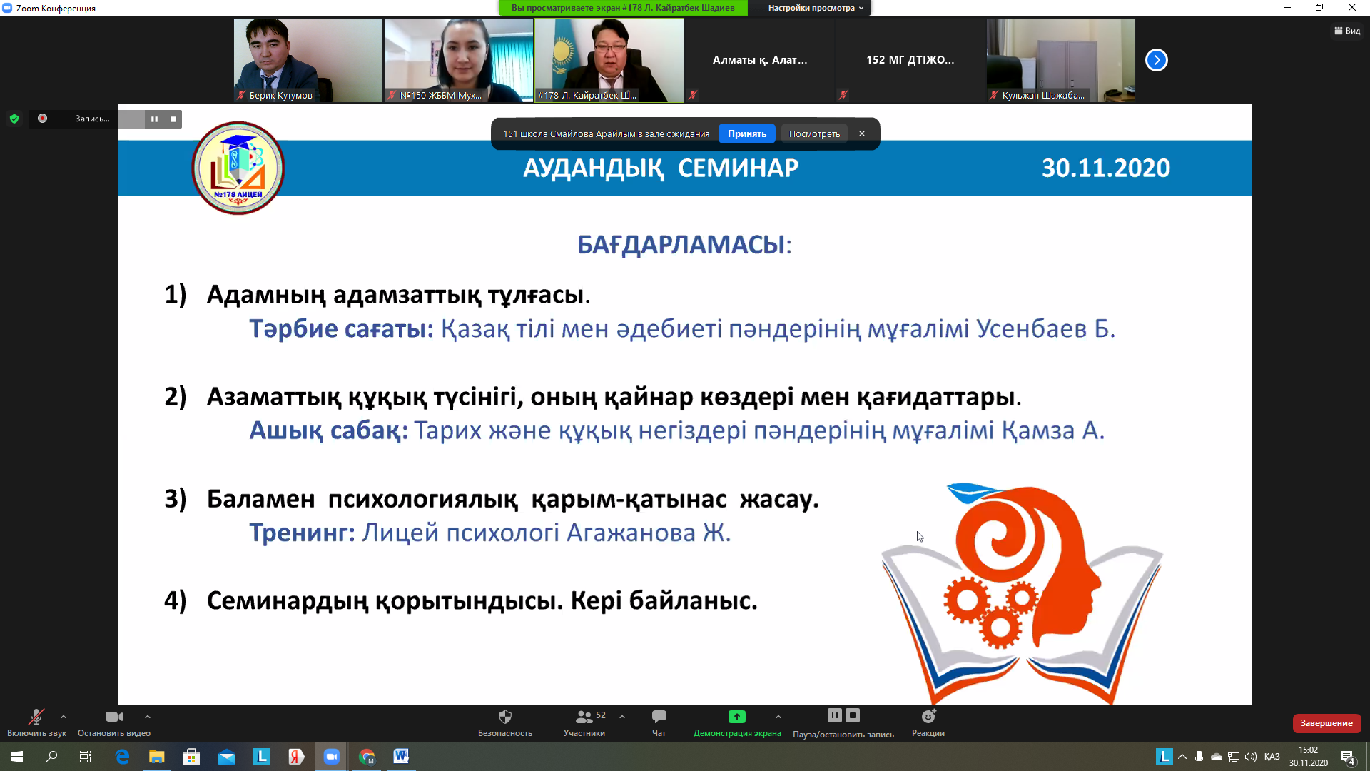 Алатау ауданы білім бөлімінің іс-шаралар жоспарына сәйкес №178 лицейде 2020 жылдың 30 қараша күні директордың тәрбие ісі жөніндегі орынсабарлары Б.Кутумов пен М.Дүйсенбекованың ұйымдастыруымен ZOOM конференция залында "Менің азаматтық ұстанымым" тақырыбында аудандық семинар өтті. Мақсаты – жеке тұлғаның қоғам алдындағы әлеуметтік және азаматтық жауапкершілігін сезінуге үйрету, рухани-адамгершілікке тәрбиелеу, азаматтық ұстанымдары мен көзқарастарын қалыптастыру.