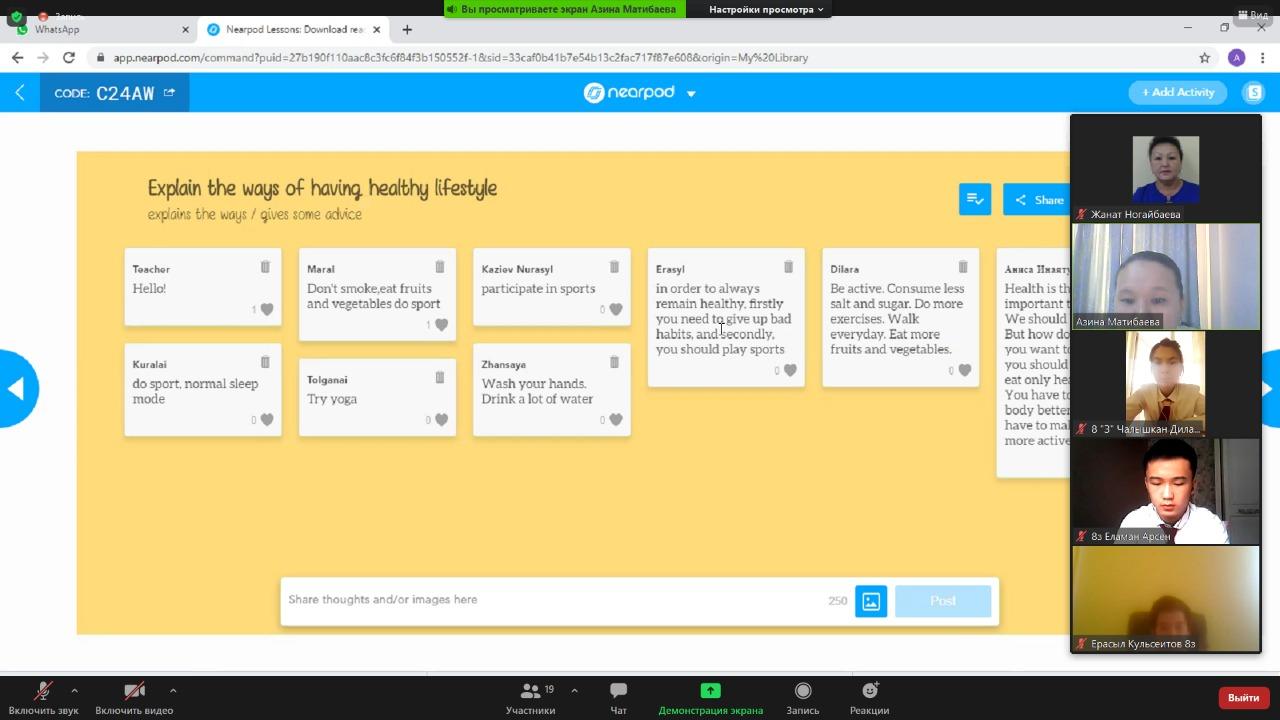 2020 жылдың 7 желтоқсан күні ағылшын тілі пәнінен 8 "З" сыныбында " Prysical activities" /мұғалімі Матибаева А./ және "Janes sport blog" /мұғалімі Бисакал Ж./ ашық сабақтарын өткізді. Сабақтарында оқушыларға тапсырмаларды орындату мақсатында "Nearpod Lessions" интерактивті программасы," Kahoot" ойыны қолданылды. Салауатты өмір салтына байланысты бейне материалдар, презентациялар сабақтың мазмұнын ашып, тілдік дағдыларды дамытуға арналған интерактивті тапсырмалар ұтымды жүргізілді. Оқушылармен кері байланыс жасалды.