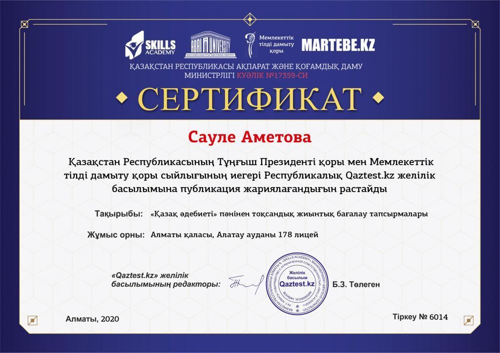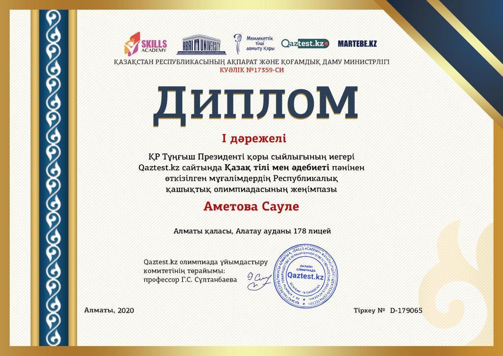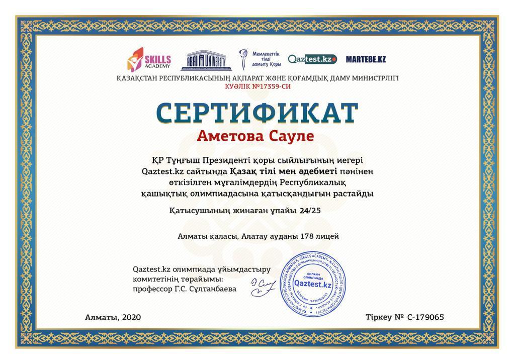№178 лицейдің Қазақ тілі мен әдебиеті пәнінің мұғалімі Аметова Сауле Орынбасарқызы Республикалық Qaztest.kz сайтында Қазақ тілі мен әдебиеті пәнінен өткізілген мұғалімдердің Республикалық қашықтық олимпиадасына белсенді қатысқаны үшін және сапалы материал жариялағаны үшін марапатталды.
