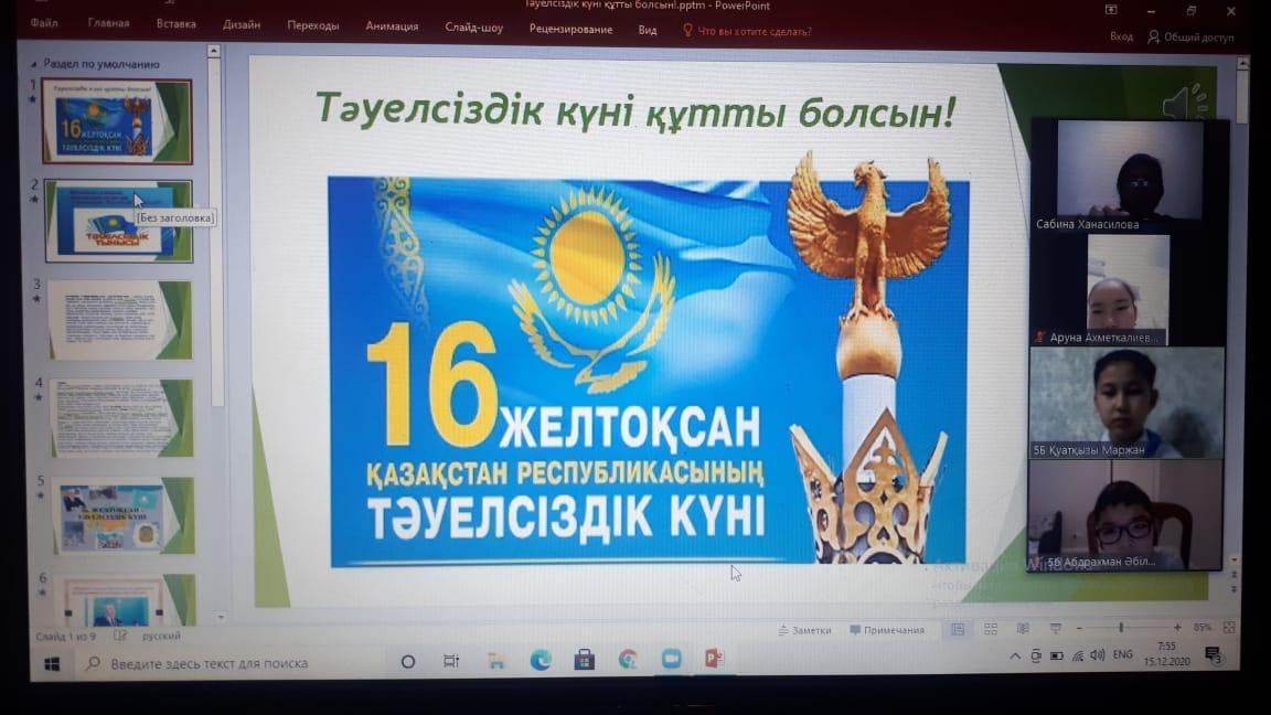 Қазақстан Республикасының Тәуелсіздік күндерінің құндылықтарын насихаттау мақсатында 16 желтоқсан - Тәуелсіздік күніне орай №178 лицейде 15 желтоқсан күні 5-11 сыныптарда "Мәңгілік ел – біздің күш-қуатымыз" тақырыбында бірыңғай сынып сағаттары өткізілді.