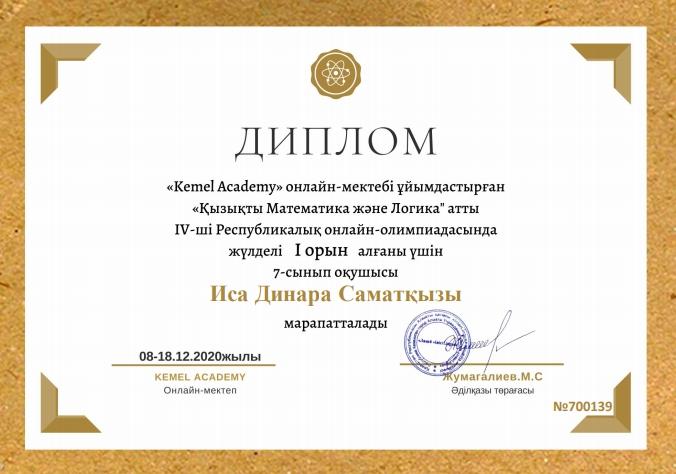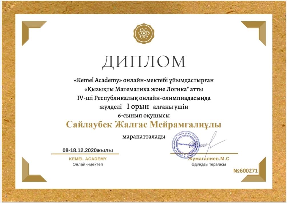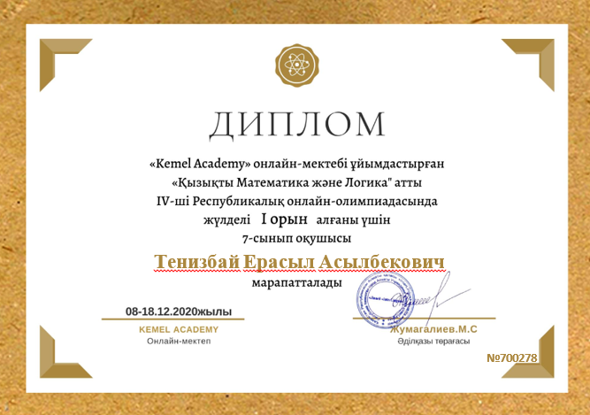 "Kemel Academy" онлайн-мектебі үйымдастырған "Қызықты математика және логика" атты IV Республикалық онлайн-олимпиадасы өткізілді. Олимпиаданың мақсаты: оқушылардың математикадан білім деңгейлерін анықтап, логикалық, қызықты есептерді де шығара білуін тексеру. Оқушылардың ойлау қабілетін дамыту. Оқушыларды біліктілікке, тез әрі дұрыс жауап беруге, ұйымшылдыққа тәрбиелеу. Осы, "Қызықты математика және логика" атты IV Республикалық онлайн-олимпиадасына №178 лицейдің оқушылары қатысып, жұлделі орындарға ие болып, арнайы дипломдармен марапатталды. Шәкірттерімізге шығармашылық қабілеттерін арта берсін деп тілейміз!
