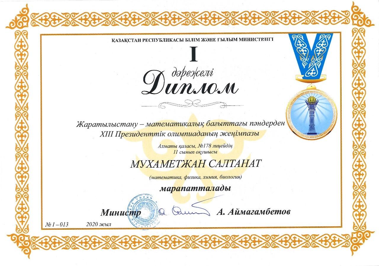 Биылғы жылды лицейіміздің оқушылары керемет, жарқын жетістіктермен қорытындылады. Себебі, желтоқсан айының төртінші жұлдызы күні "Жаратылыстану-математика циклы" пәндері бойынша Президенттік олимпиада өз мәресіне жетті. Президенттік олимпиада ҚР Білім және ғылым министрлігі тарапынан өткізілетін жыл сайынғы іс-шара болып табылады. Осы республикалық Президенттік олимпиадаға №178 лицейдің 11 сынып оқушылары қатысып, жүлделі орындарға ие болды. Атап айтсақ, Мұхамеджан Салтанат – І орын, Құсаинов Бексұлтан – ІІІ орын, Абдумалик Махаббат – ІІІ орын иегері атанып, Білім және ғылым министрінің дипломдарымен марапатталып, ұстаздары сенім артқан абыройды ойдағыдай ақтай білді. Барлық кезеңдерден сүрінбей өткен дарынды оқушыларымызды шын жүректен құттықтаймыз! Білім жолындағы ауыз толтырып айтарлықтай жарқын жеңістеріміз көп болсын!