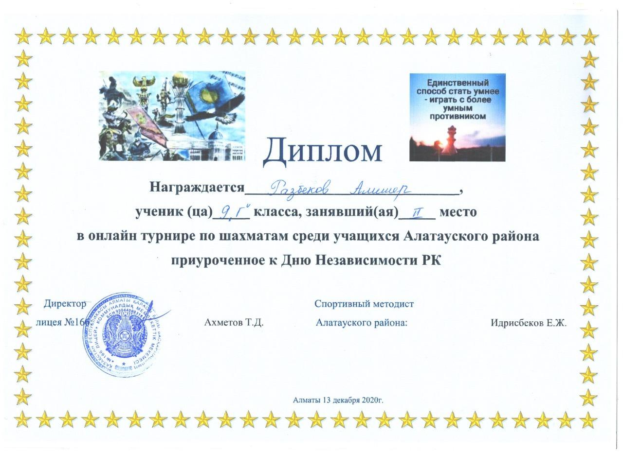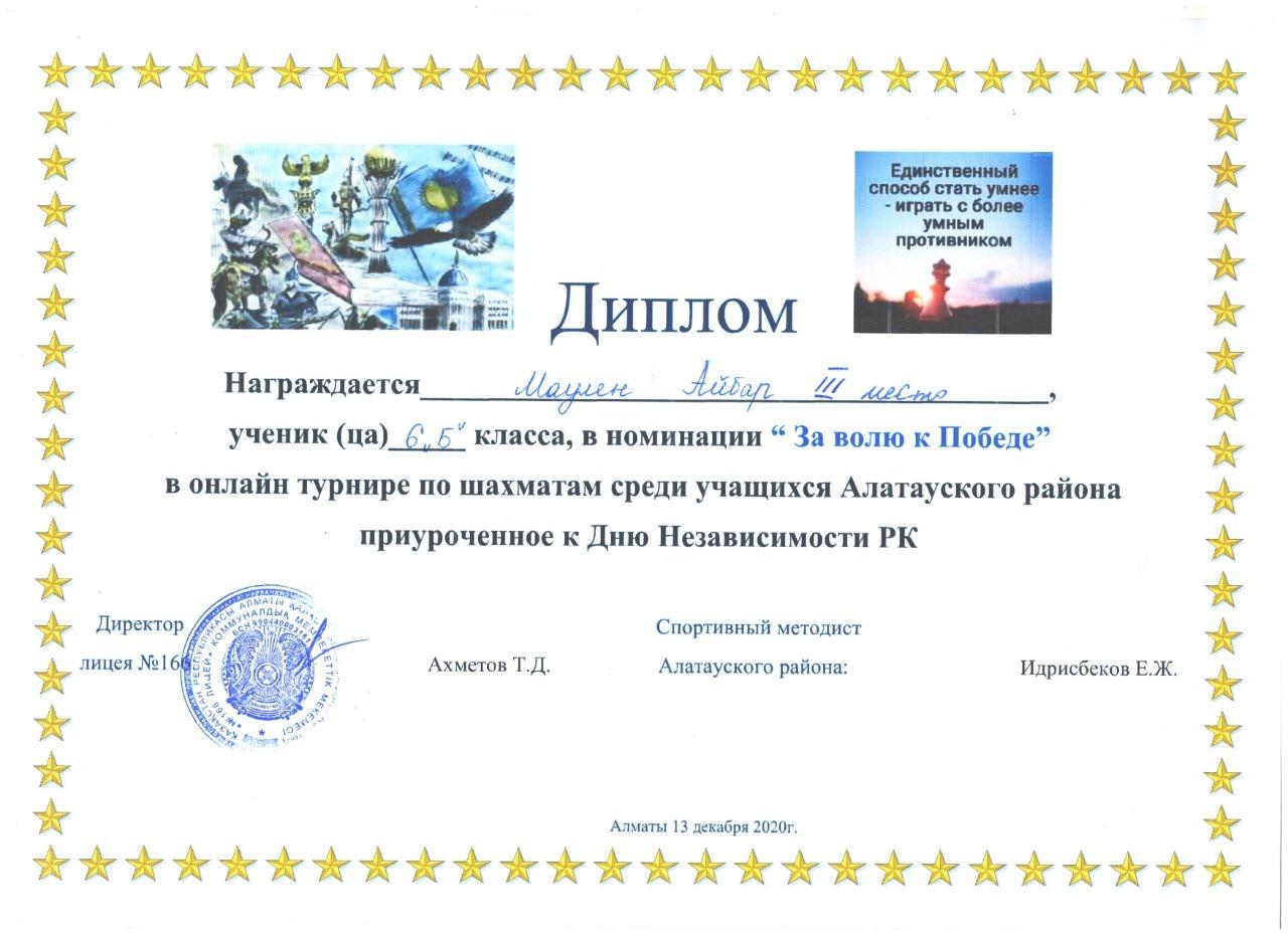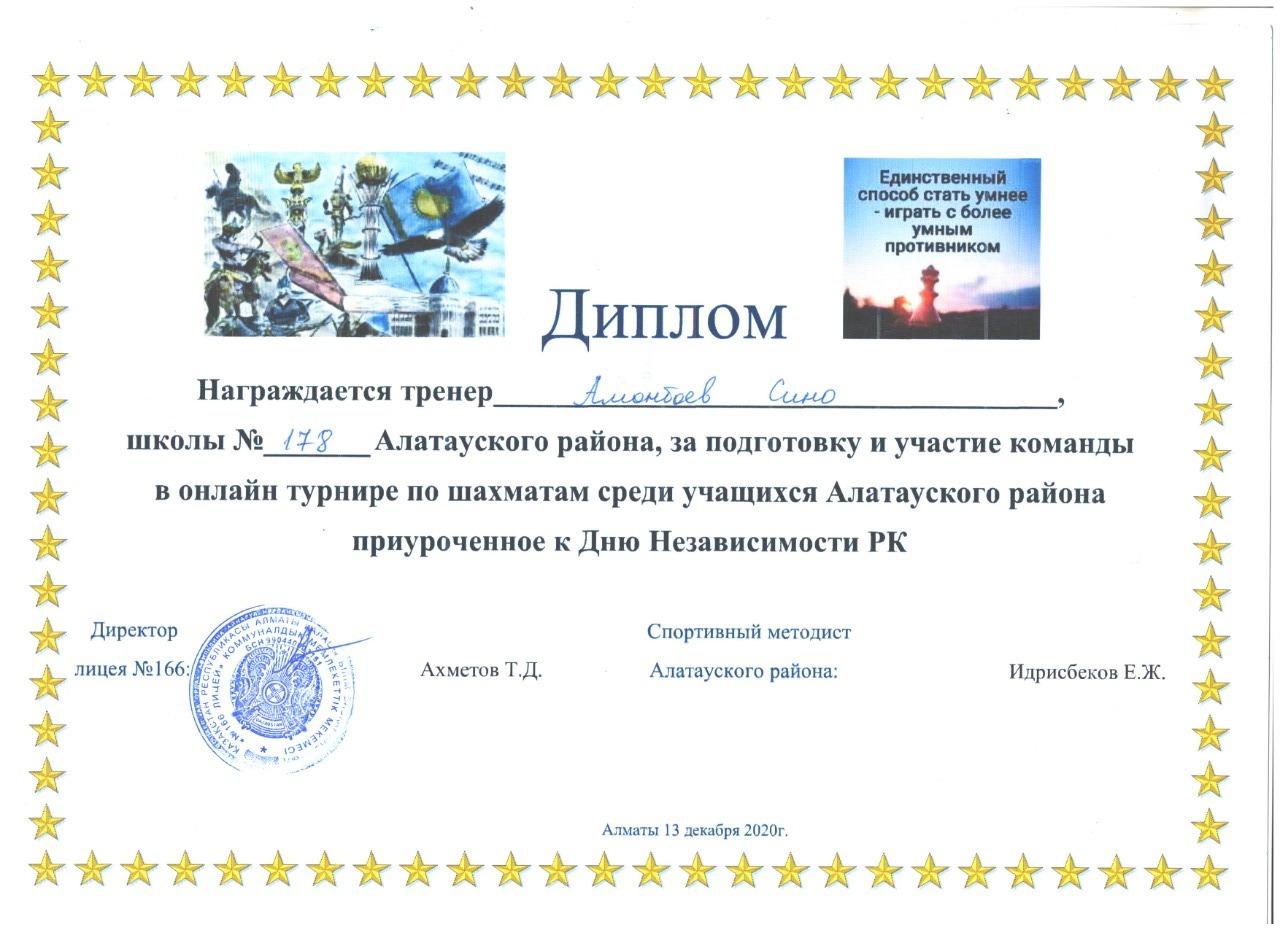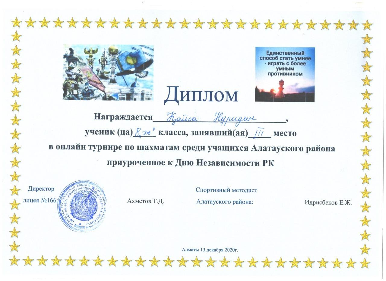 30 декабрь 2020 0 1 2 3 4 5 Үйірме жұмыстары: Шахматтан онлайн турнир жеңімпаздары Қазақстан Республикасы Тәуелсіздігі күніне орай Алатау ауданы оқушылары арасында өткен шахматтан онлайн турнирде №178 лицей оқушылары жүлделі орындарға ие болды. Жетекшісі: Амонбоев Сино Осы беттің QR-коды:QR-код этой страницы: