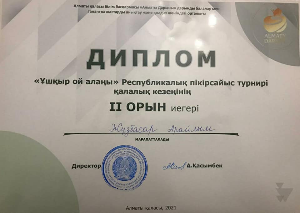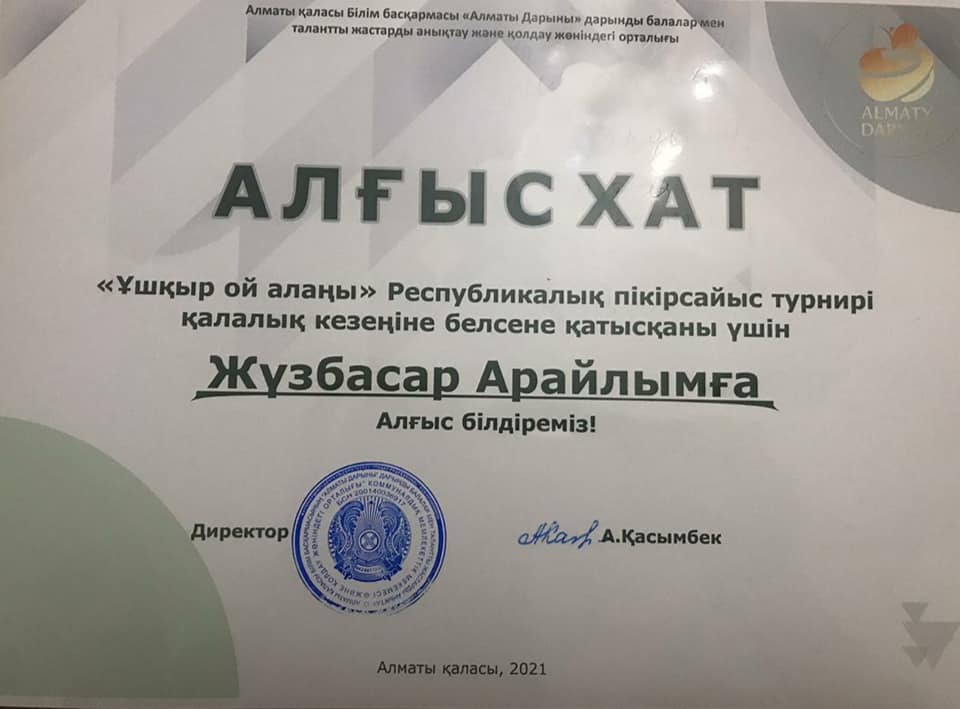 Алматы қаласы Білім басқармасының "Алматы дарыны" дарынды балалар мен талантты жастарды анықтау және қолдау жөніндегі орталығында оқушылар арасында "Ұшқыр ой алаңы" Республикалық дебаттық турнирінің қалалық кезеңі (қазақ лигасы) өтті. Турнирге Алматы қаласынан 8 үздік команда қатысты. Әділқазылардың шешімі бойынша жүлделі ІІ орын алған жеңімпазымыз мамандандырылған №178 лицей оқушысы Жүзбасар Арайлым марапатталды.