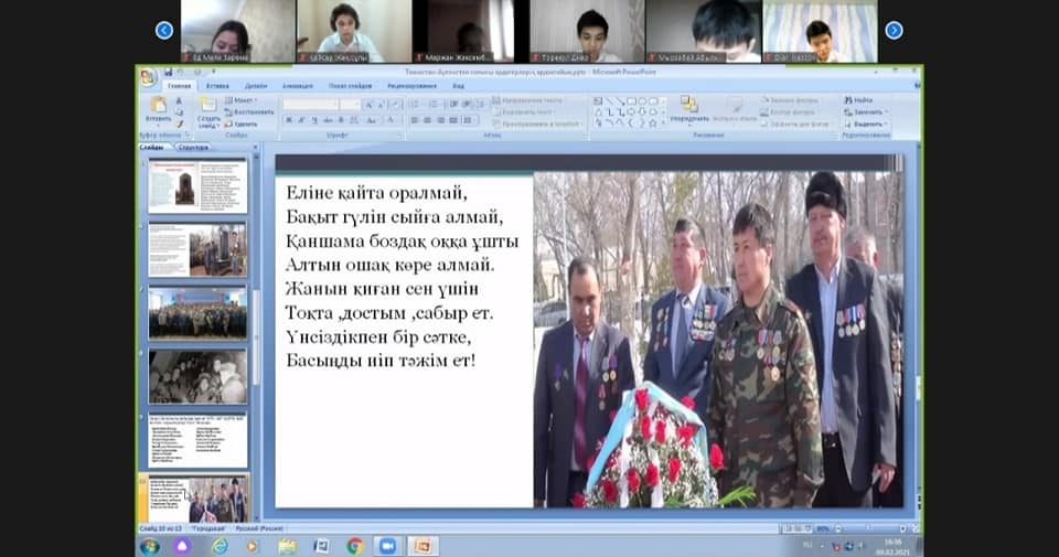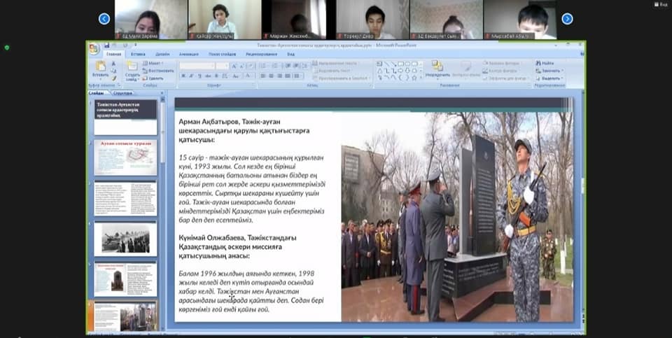 №178 мамандандырылған лицейде Тәжікстан-Ауғанстан шекарасындағы әскери қақтығыстарға қатысқан ардагерлердің еңбектерімен таныстыру мақсатында тарих пəнінің мұғалімі Ибрагимова Ұлту "Тәжікстан-Ауғанстан соғысы ардагерлерін ардақтайық" тақырыбында 8 сыныптар арасында танымдық сабақ өткізді.