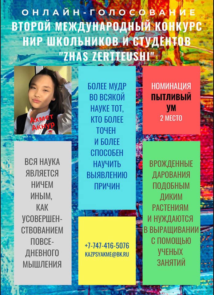 Абай атындағы Қазақ Ұлттық педагогикалық университеттің ұйымдастыруымен ақпан айының 27 күні өткен жалпы білім беретін мектеп оқушыларына және студенттерге арналған ІІ Халықаралық «Жас зерттеуші» атты ғылыми жоба жұмыстары конкурсында 10 «Ә» сынып оқушысы Ахмет Ақнұр лауреат атанып, «Ізденімпаз» номинациясы бойынша ІІ жүлделі орынға ие болды. Ғылыми жетекшісі: Кенжебаева Жанна. Шәкіртімізге шығармашылық табыстар тілейміз!