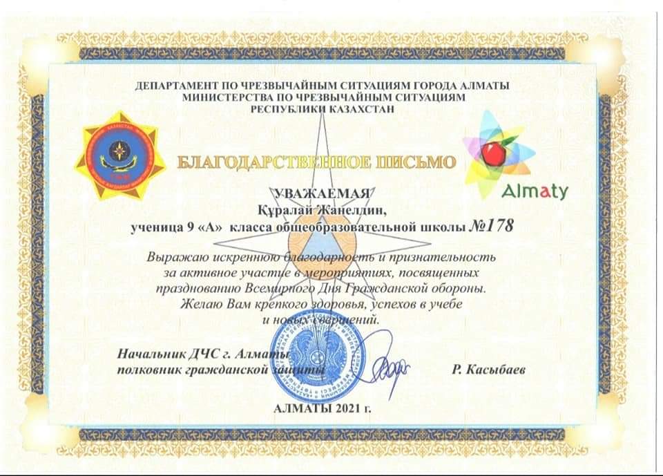 2021 жылдың 1 ақпанынан бастап Алматы қаласында Дүниежүзілік Азаматтық қорғаныс күніне арналған айлық өткен болатын. Ұраны – «ұлттық экономиканы сақтау үшін күшті азаматтық қорғаныс!». Дүниежүзілік Азаматтық қорғаныс күнін мерекелеу құрметіне арналған іс-шараларға белсенді қатысқан Алатау ауданына қарасты №178 мамандандырылған лицейдің 9 "Ә" сынып оқушысы Жанелдин Құралайға Алматы қаласы Төтенше жағдайлар департаментінің бастығы, азаматтық қорғау полковнигі Р.Ә. Қасыбаевтың алғыс хатын Алатау аудандық ТЖД басқармасының бастығы, азаматтық қорғау майоры Самат Бақытқанұлы, аудандық сайыста ерекше үлес қосқаны үшін марапаттап, табыстады.
