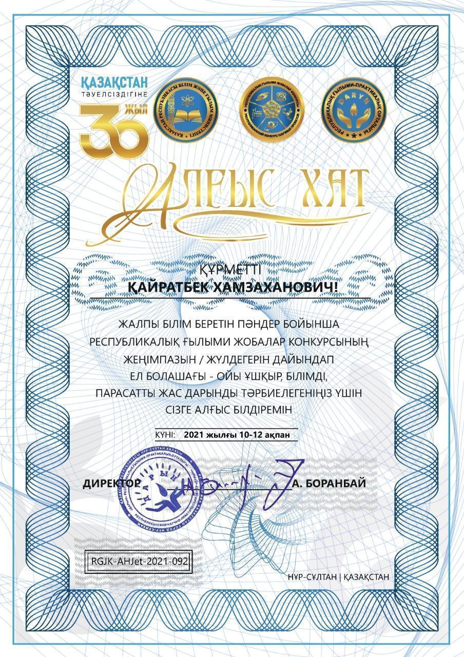 ҚР БҒМ “Дарын” ғылыми-практикалық орталығы ұйымдастырған жалпы білім беретін пәндер бойынша республикалық ғылыми жоба конкурсының жеңімпазын/ жүлдегерін дайындап, ел болашағы - ойы ұшқыр, білімді, парасатты жас дарындарды тәрбиелегендері үшін № 178 мамандандырылған лицейдің ұстаздары Шадиев Қайратбек, Шажабаева Күлжан, Смағұлова Гулнара, Сағиолданов Талант, Абдраимов Айдын, Рахатов Дастан алғыс хатпен марапатталды.