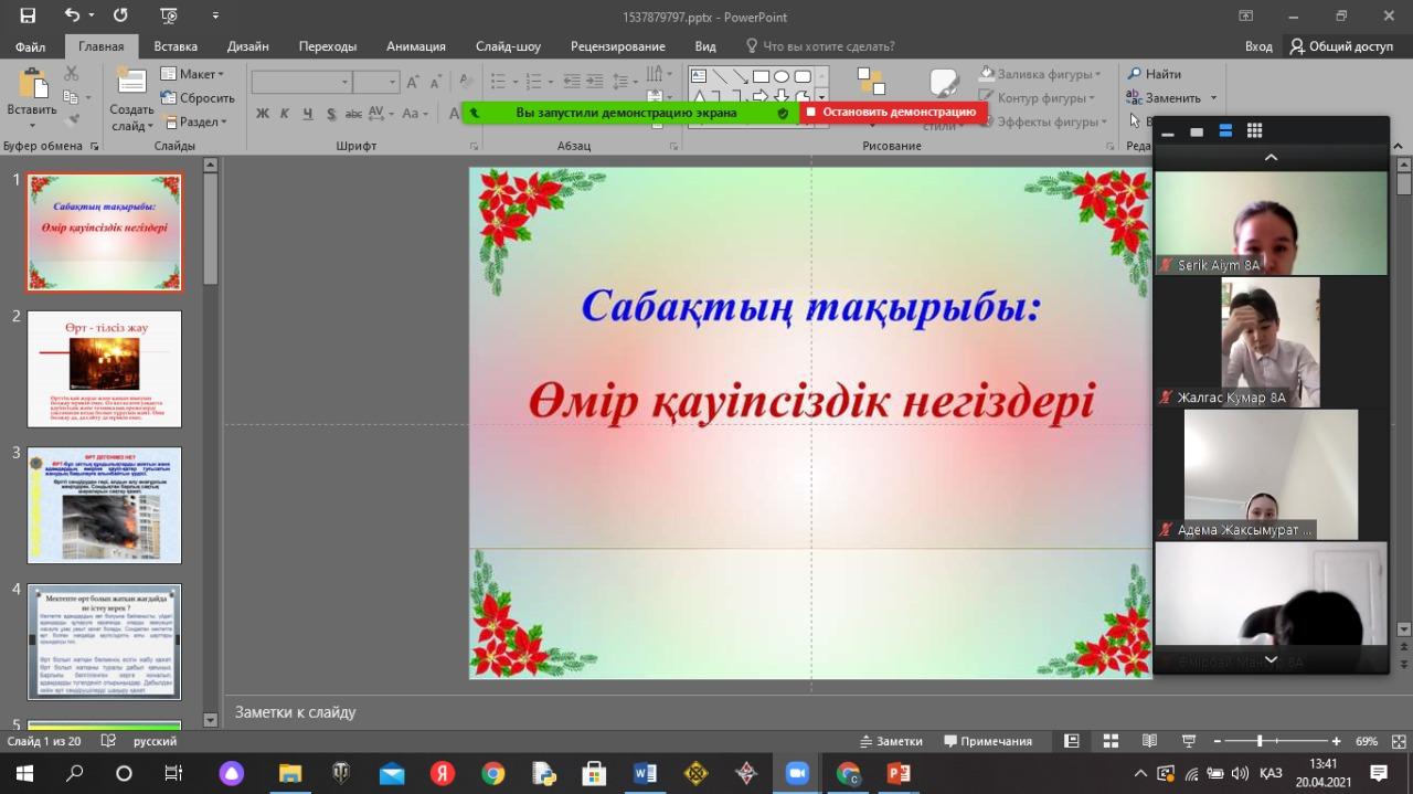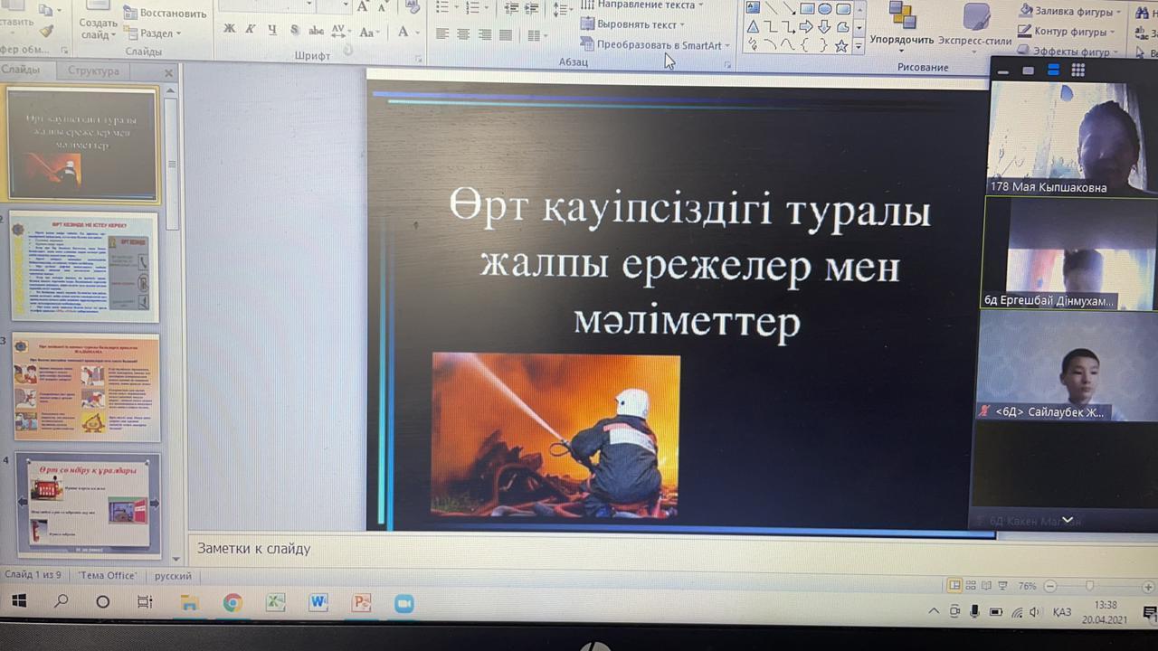 2021 жылдың 20 сәуір күні №178 мамандандырылған лицейде "Өрт қауіпсіздігі", "Сақтансаң сақ боларсың"," Адам өмір қауіпсіздігі", "Өмір қауіпсіздік негіздері" тақырыптарында 5-11 сыныптар арасында сынып сағаттары өткізілді.