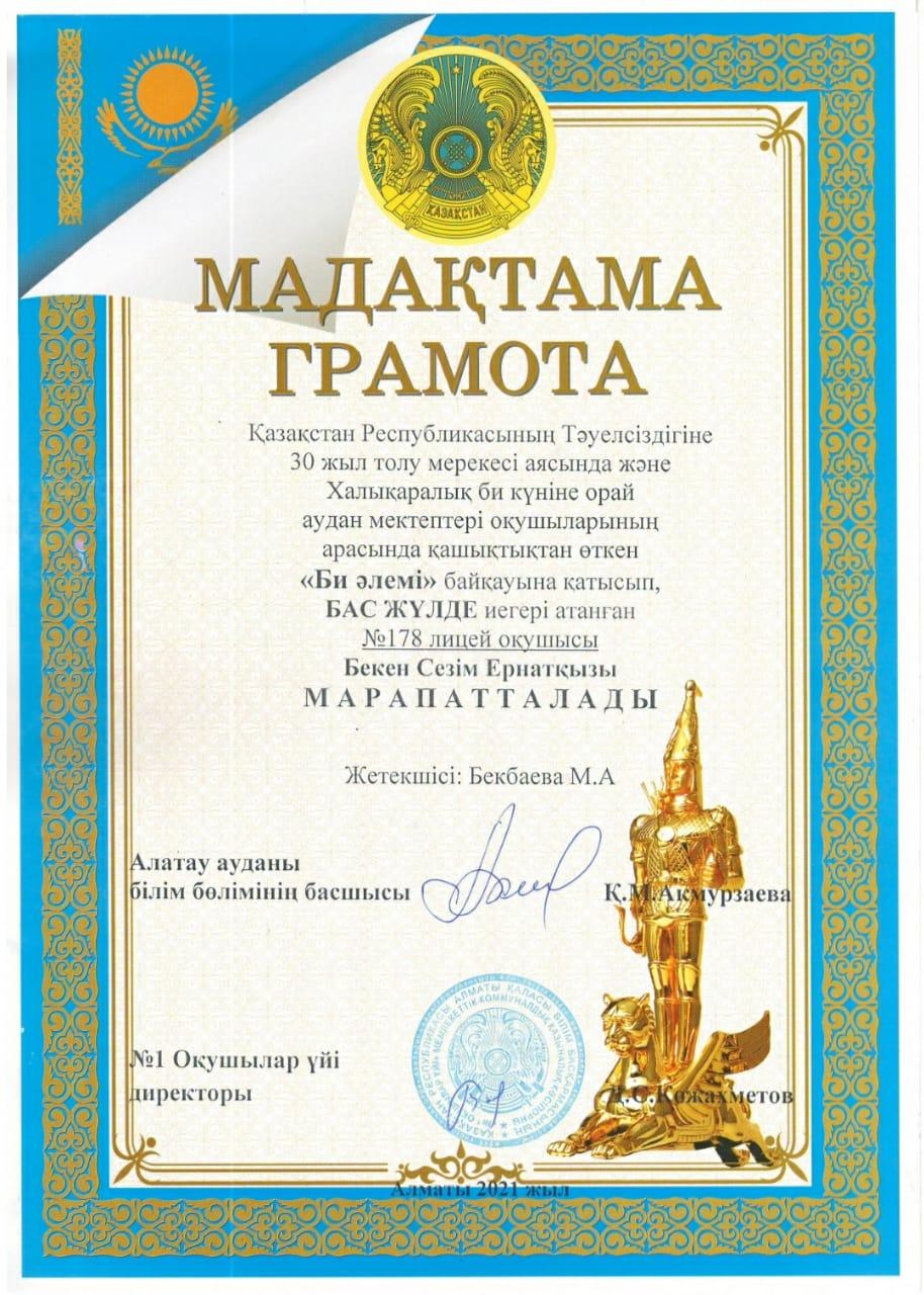 №178 мамандандырылған лицейдің 5 "Б" сынып оқушысы Бекен Сезім Қазақстан Республикасының Тәуелсіздігіне 30 жыл толу мерекесі аясында және Халықаралық би күніне орай аудан мектептері оқушыларының арасында қашықтықтан өткен "Би әлемі" атты аудандық байқауына қатысып, Бас жүлде иегері атанды. Жүлдегер оқушымызға мадақтаманы лицей директоры Қайратбек Хамзаханұлы табыстап, жеңісімен құттықтап, сәттілік тіледі.