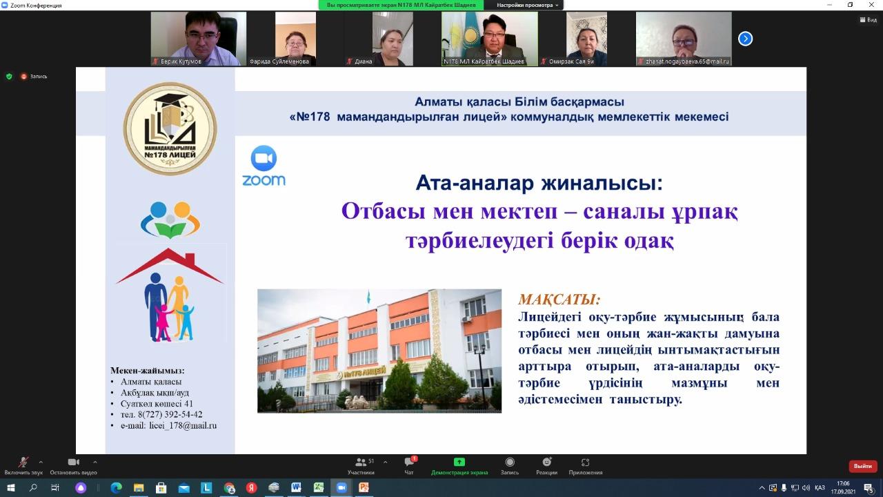 №178 мамандандырылған лицейде 5-11 сынып ата-аналарына «Отбасы мен мектеп - саналы ұрпақ тәрбиелеудегі берік одақ» тақырыбында жалпы ата-аналар жиналысы онлайн режимінде өтті. Жиналысты №178 мамандандырылған лицей директоры К.Х.Шадиев алғы сөзбен бастады. Онлайн жиналыс барысында Абай атындағы Қазақ Ұлттық педагогикалық университеті Тарих мамандығының PhD докторанты Сейтқазиев Руслан Өмірғазыұлы «Бала тәрбиесіндегі жауапкершілік: отбасындағы әке мен ананың міндеті. Мұғаліммен кері байланыс» тақырыбында баяндама оқыды. Директордың оқу-тәрбие ісі жөніндегі орынбасарлары Даулетбаева Гулнафис Абатовна және Токталиева Гулзат Дуйшенбековна «Мамандандырылған лицейде оқу-тәрбие жұмысын ұйымдастырудың ерекшеліктері» туралы маңызды ақпараттармен бөлісті. Сонымен қатар директордың ғылыми ісі жөніндегі орынбасары Баймуратов Алибек Кыдырхожаевич «Дарынды оқушылармен жұмысты ұйымдастыру жолдары» тақырыбында биылғы оқу жылында кеңінен атқарылатын жұмыстарды тілге тиек етті. Кері байланыс ретінде ата-аналар белсенді түрде қатысып, өздерін толғандырған сұрақтарын қойып, лицей әкімшілігі тарапынан тұщымды жауаптарын ала білді.