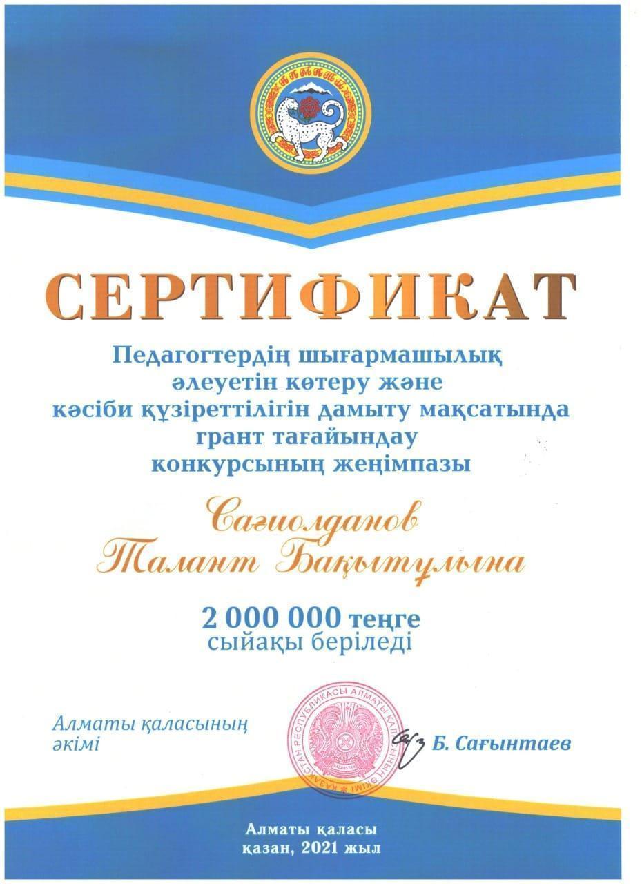 Алатау ауданы N178 мамандандырылған лицейдің математика пәнінің мұғалімі, педагог-зерттеуші Талант Бақытұлы Сағиолданов Алматы қаласы әкімінің Педагогтердің шығармашылық әлеуетін көтеру және кәсіби құзыреттілігін дамыту мақсатында грант тағайындау конкурсының жеңімпазы атанды. Алматы қаласының әкімі Б.Ә. Сағынтаевтың өз қолынан 2000000 теңге сыйақының сертификатын алды. Құттықтаймыз!