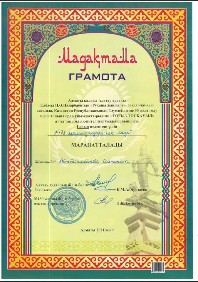 Алматы қаласы Алатау ауданы Білім бөлімі Елбасы Н.Ә. Назарбаевтың "Рухани жаңғыру" бағдарламасы аясында, Қазақстан Республикасының Тәуелсіздігіне 30 жыл толу мерейтойына орай ұйымдастырған "Тоғыз тосқауыл" атты танымдық-интеллектуалдық ойында №178 мамандандырылған лицейдің 8-10 сынып оқушылары І орынды иеленіп, жеңіс тұғырынан көріне білді. Лицей оқушыларының білім шыңдарын бағындырарына кәміл сенім артамыз, құтты болсын!