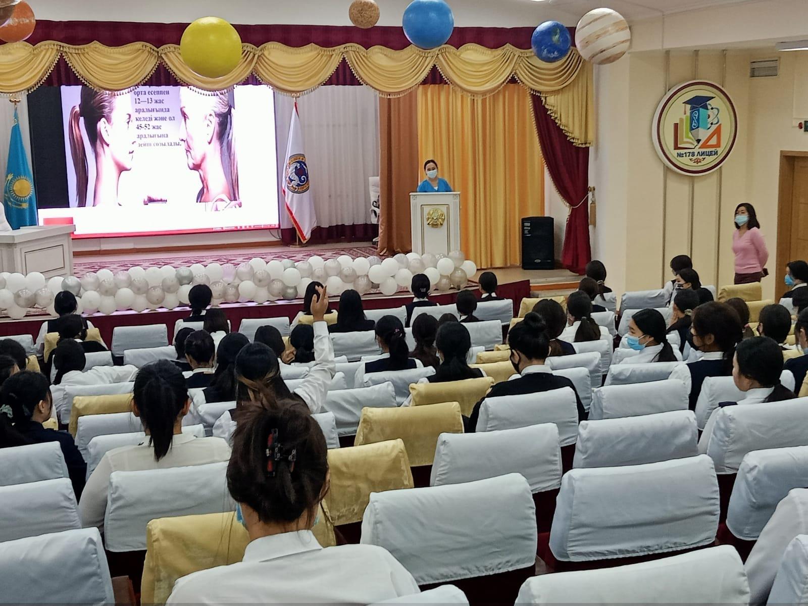 2021 жылдың 7 желтоқсан күні №178 мамандандырылған лицейдің 9-11 сынып қыздары үшін «Жыныстық қатынастан берілетін аурулар, жүктілікті болдырмау - контрацепция жолдары» атты тақырыпта №29 қалалық емхананың «Жастар денсаулық орталығының» гинеколог маманы Тоғжан Саматқызы мен лицей психологтары Агажанова Жанна, Жамалова Гаухар бірлесе отырып кездесу өткізді. Кездесуде қыз балалардың жеке бас гигиенасын сақтауы, жасөспірім қыз баланың өзін-өзі дұрыс ұстауы, сондай-ақ рухани және әлеуметтік жағынан да белгілі бір жетілуге жетуі керектігі жайлы айтылды.