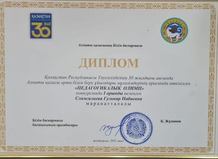 Қазақстан Республикасының Тәуелсіздігінің 30 жылдығы аясында Алматы қаласы орта білім беру ұйымдары арасында өткізілген жаратылыстану және математикалык пәндер мұгалімдерінің кәсіби шеберлігін шыңдаған «ПЕДАГОГИКАЛЫҚ ОЛИМП» конкурсы өз мәресіне жетті. Конкурс қорытындысында N 178 мамандандырылған лицейдің физика пәнінің мұғалімі, педагог-шебер Слямгалиева Гульнар Набиевна І орын иеленді. Гульнар Набиевнаға алар асуыңыз шыңдала берсін деп тілек білдіреміз!