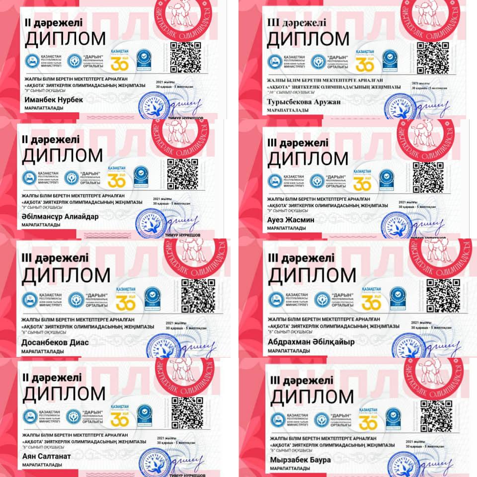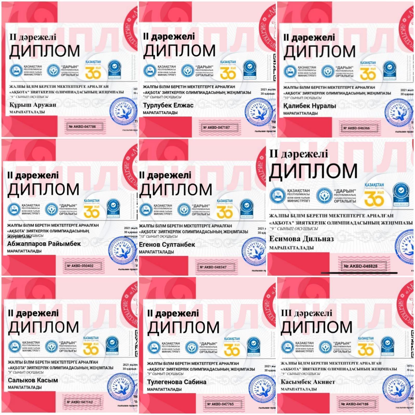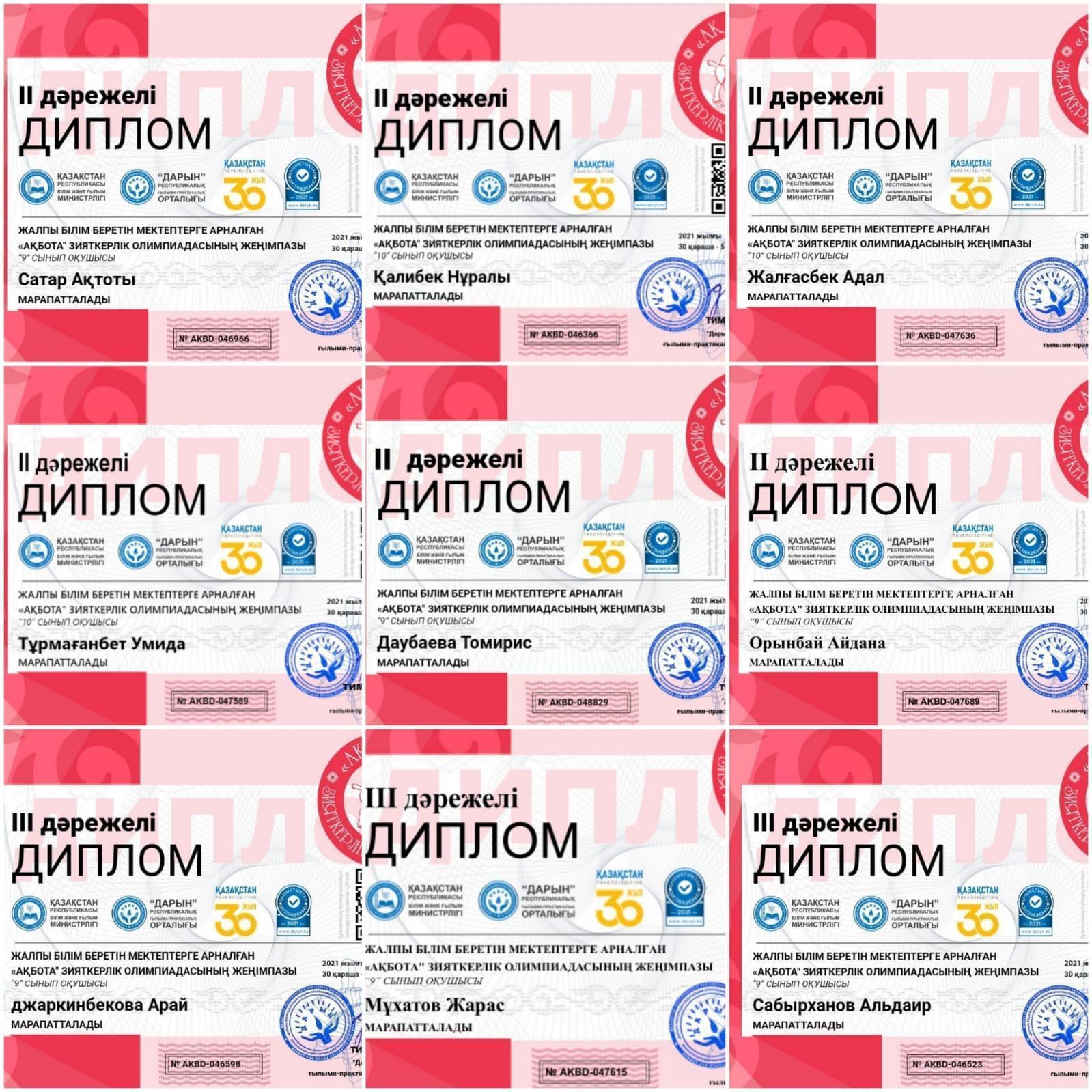 ✨ 2021-2022 оқу жылының І жартыжылдығында «Дарын» республикалық ғылыми-практикалық орталығының ұйымдастыруымен «Ақбота» зияткерлік олимпиадасы өтті. Олимпиаданың негізгі мақсаты - дарынды балаларды анықтау және қолдау, оқушының оқу-танымдық іс-әрекеттерін ынталандыру, зияткерлік ойындар мен жарыс, олимпиадаларға ізденімпаздың қызығушылығын арттыру болды.