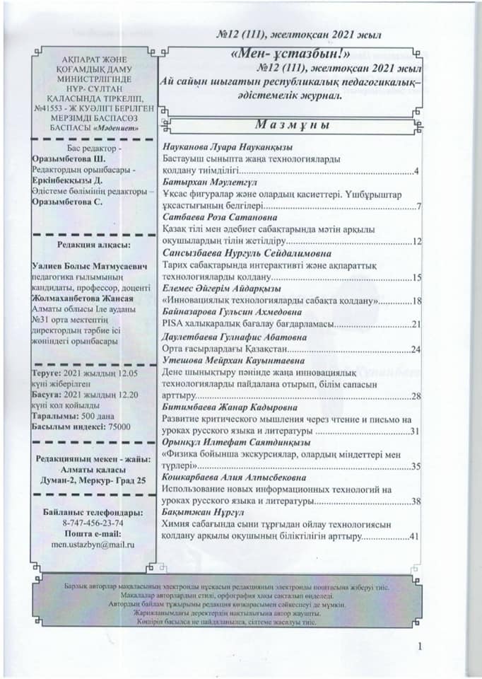 Лицей мұғалімдерінің мақалалары “Мен - ұстазбын" Республикалық педагогикалық-әдістемелік журналда жарық көрді.