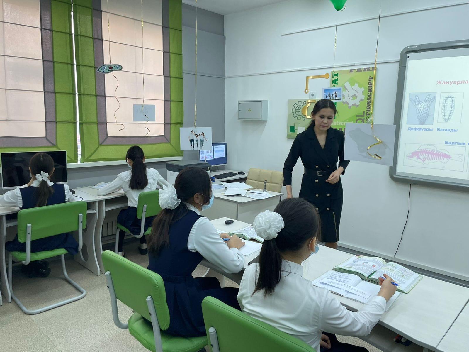 Жаратылыстану кафедрасының онкүндігі аясында №178 мамандандырылған лицейдің биология пәні мұғалімі Айдарова Айдана Берікқызы 7 "Ә" сыныбымен "Жануарлардың жүйке жүйесінің типтері" тақырыбында ашық сабақ өткізді. Сабақтың ұйымдастыру кезеңіндегі сәлемдесу тренингі оқушыларға көтеріңкі көңіл-күй сыйлап, ерекше атмосферада басталды. Сынып бөлмесі әсемделген әуедегі шарларға ілінген суреттер өткен сабақты еске түсірді. "Төңкерілген сынып" технологиясы тиімді жүзеге асты. Оқушылар сабақ барысында белсенді болды. Мұғалім сабақ тақырыбына сай оқу мақсатын, бағалау критерийлерін және әр тапсырмаға сай дескрипторларды жүйелі ұсынып, іс-жүзінде нәтижелі жүзеге асты. Сыныпта жеке, топтық жұмыстарды орындату арқылы оқушылардың жауапкершілігін, уақытты тиімді пайдалану дағдысын, сыни сұрақтар қою арқылы сын тұрғысынан ойлауын дамыту және әр тапсырмада пайдаланған платформалар мен қосымшалар арқылы ақпараттық-технологиялық қабілеттерін арттыру жұмысын жүзеге асыра білді. Оқушылардың өзін-өзі және өзара бағалау жұмысы мұғалім жетекшілігі негізінде шынайы жүзеге асты.