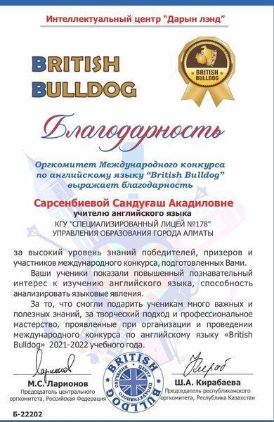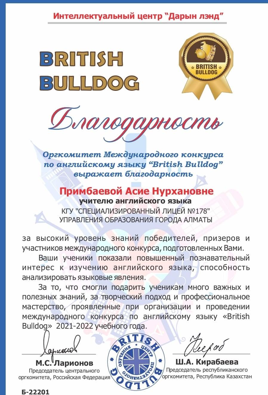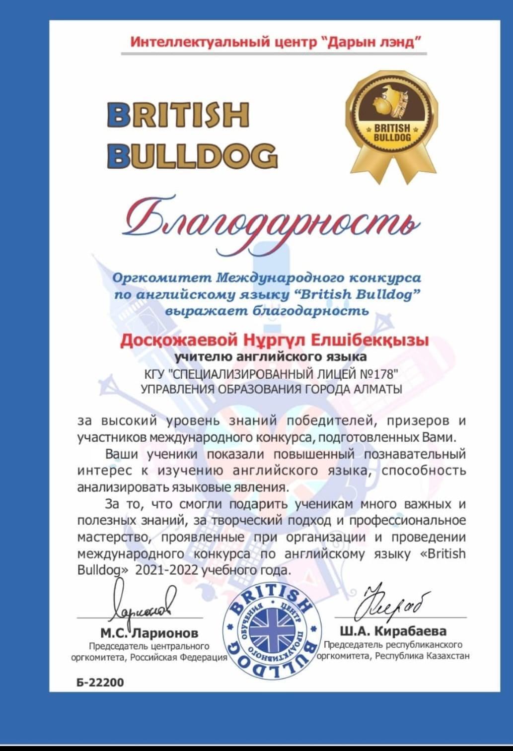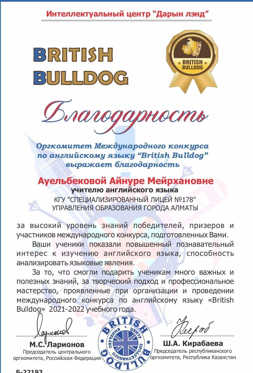🥇🥈🥉Халықаралық байқауға оқушы дайындап, қатыстырған жүлдегерлер мен қатысушылардың жоғары білім деңгейі үшін ағылшын тіліндегі «British Bulldog» Халықаралық байқаудың ұйымдастыру комитеті №178 мамандандырылған ағылшын тілі пән мұғалімдеріне алғысын білдірді.