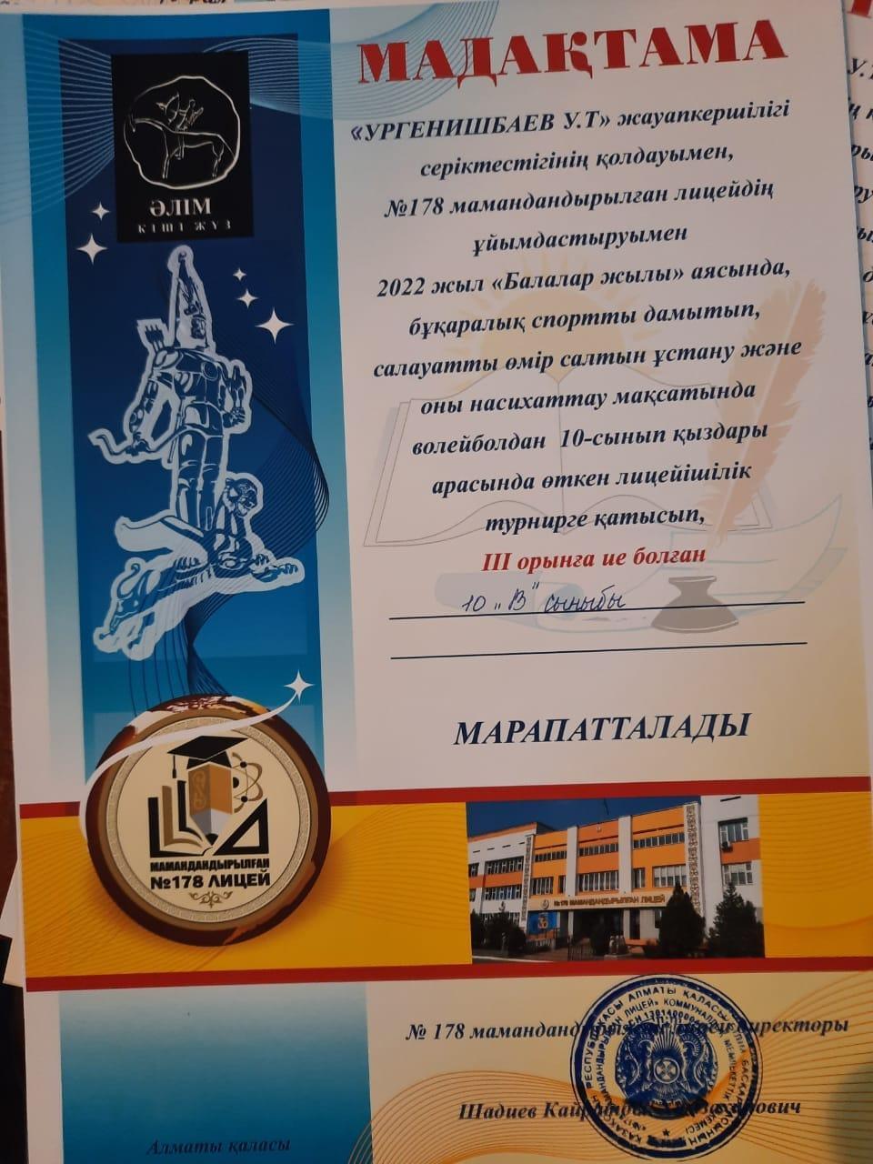 Өзін-өзі басқару ұйымының жылдық жоспарына сәйкес "Балалар жылы" аясында лицейімізде 10-сынып қыздары арасында волейболдан лицейішілік турнир өткізілді. Турнирдің қорытындысы бойынша: І орын - 10 "Ж" сыныбы (сыйлық қоры 25 000 тг); ІІ орын - 10 "Г" сыныбы (сыйлық қоры 20 000 тг), ІІІ орын - 10 "В" сыныбы (сыйлық қоры 15 000 тг) иеленді.