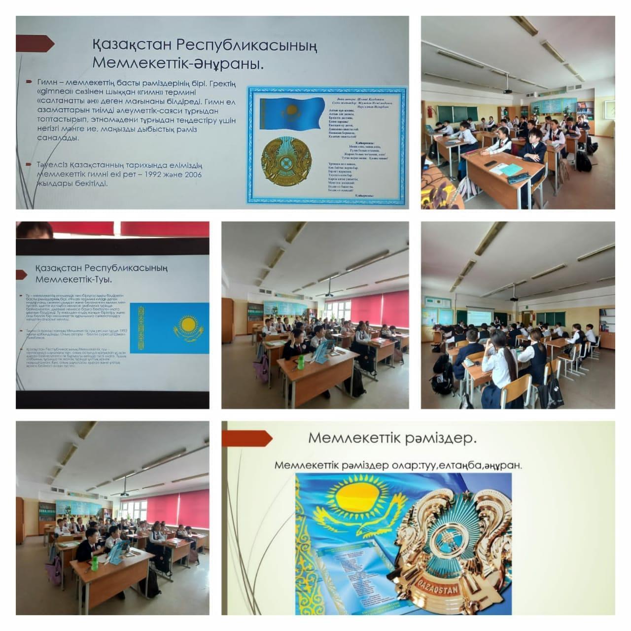 5-11 сыныптар арасында "Мемлекеттік рәміздер - ұлт мақтанышы" такырыбында сынып сағаттары өткізілді.
