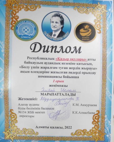 22.04.2022ж Республикалық "Қадыр оқулары" атты байқаудың аудандық кезеңінде ақын өлеңдерін мәнерлеп оқу бойынша Мәли Зарема өзінің өлең оқу шеберлігімен көзге түсіп, "Сөз зергері" номинациясына ие болды. Ал Әлібай Ислам ақын өлеңдеріне жазылған әндерді нақышына келтіре орындап, І-орын жеңімпазы атанып, қалалық кезеңге жолдама алды. Жас талантқа "қалалық кезеңде елді өнеріңмен қуантып, биік белестерді бағындыра бер!" деп, сәттілік тілейміз. Жетекшісі қазақ тілі мен әдебиеті пәнінің мұғалімі Абдумуталипова Перизатты шәкіртінің жеңісімен құттықтаймыз!