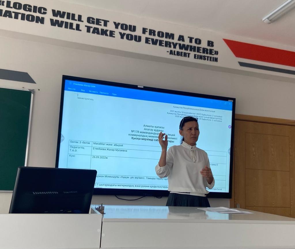 №178 мамандандырылған лицейдің жас мамандарының кезекті отырысы психологиялық тимбилдингтен басталды. Лицей психологі Ж.Агажанова жас мамандар арасында достық қарым-қатынасты және өзара көмек көрсету принциптерін құру мақсатында ұйымдастырған тимбилдинг бірлік-шығармашылық- ынтымақтастық шараларының көрінісі болды. «Жас мамандар» мектебінің жетекшісі Б.Усентаева ағымдағы жылдың жоспарымен таныстырып, атқарылатын іс-шаралардың ерекшеліктеріне тоқталды. Жас мамандарға тәлімгерлер тарапынан берілген ұсыныстардың әсері ерекше болды. Сонымен қатар, қазақ тілі мен әдебиеті пәнінің мұғалімі Ж.Етекбаеваның «ҚМЖ құрастырудағы инклюзивті білім беру туралы түсінік» тақырыбындағы баяндамасы жас маманның ҚМЖ жазудағы өзіндік тұжырымдары мен құнды пікірлерімен сабақтасты.