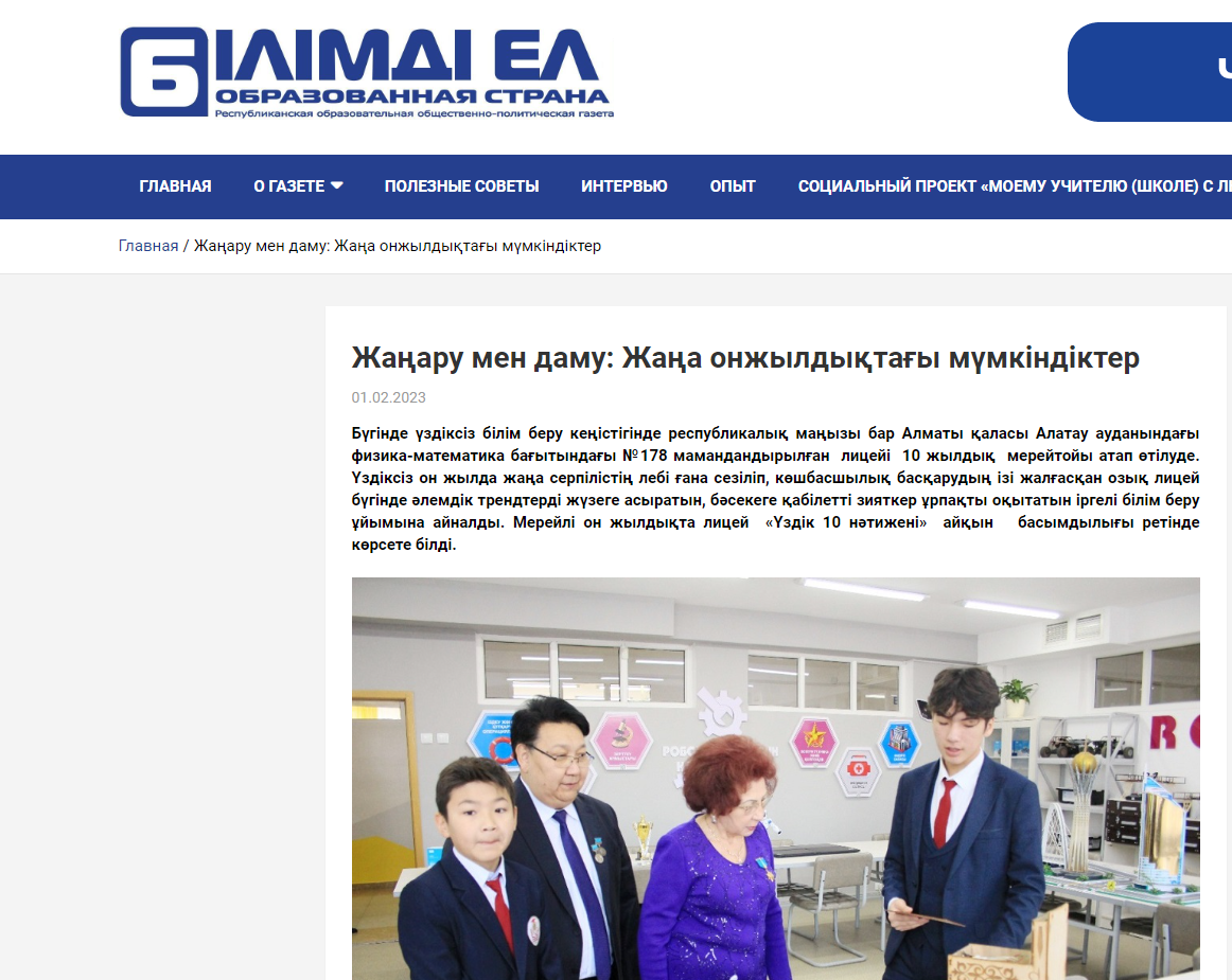 №178 мамандандырылған лицейдің 10 жылдық мерейтойына орай лицей директоры Шадиев Қайратбек Хамзаханұлының "Жаңару мен даму: Жаңа онжылдықтағы мүмкіндіктер" тақырыбындағы мақаласы "БІЛІМДІ ЕЛ" газетіне жарық көрді.
