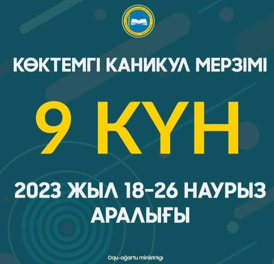 17 март 2023 0 1 2 3 4 5 Мектеп оқушыларының көктемгі демалысы 2023 жылғы 18-26 наурыз аралығын қоса алғанда 9 күнге созылады. Мектеп оқушыларының көктемгі демалысы 2023 жылғы 18-26 наурыз аралығын қоса алғанда 9 күнге созылады. Осы беттің QR-коды:QR-код этой страницы: