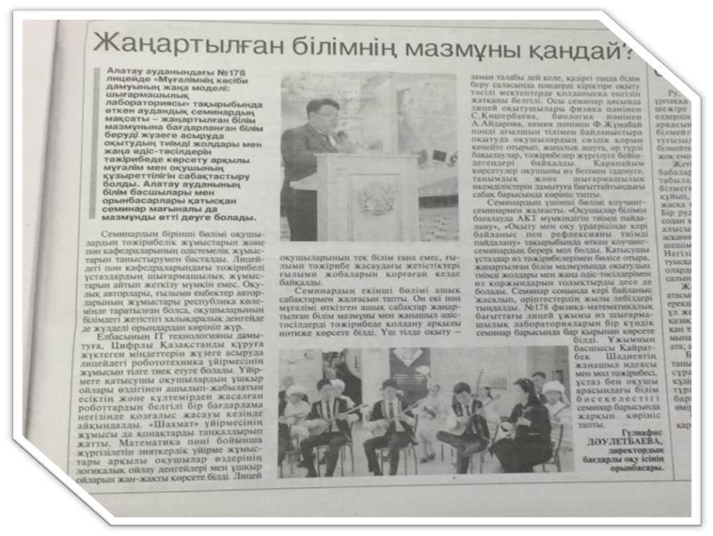 18 апрель 2019 0 1 2 3 4 5 Жаңартылған білімнің мазмұны қандай? 26.02.2019ж күні Алатау ауданындағы №178 лицейде «Мұғалімнің кәсіби дамуының жаңа моделі: шығармашылық лабораториясы» тақырыбында аудандық семинар өтті. Осы беттің QR-коды:QR-код этой страницы: