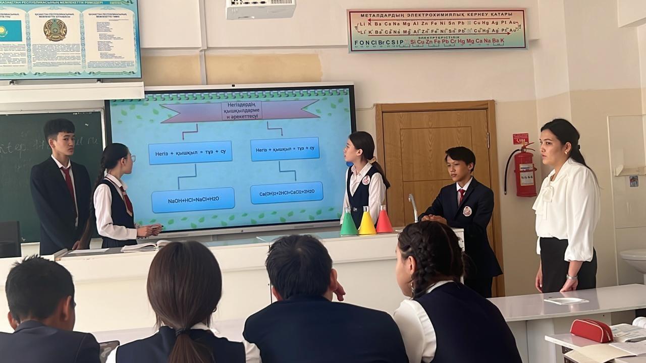 "Жаратылыстану - өмір тану, табиғаттың сырын табу" тақырыбындағы жаратылыстану пәндерінің айлығы жалғасуда. Химия пәнінің мұғалімі Тәліп Марал Нұржанқызы 8"Ә" сынып оқушыларымен "Негіздер" тақырыбында ашық сабақ өткізді. Сабақтың оқу мақсаты: негіздердің жіктелуі мен қасиеттерін білу және түсіну, олардың химиялық қасиеттерін сипаттайтын реакция теңдеулерін құрастыру.