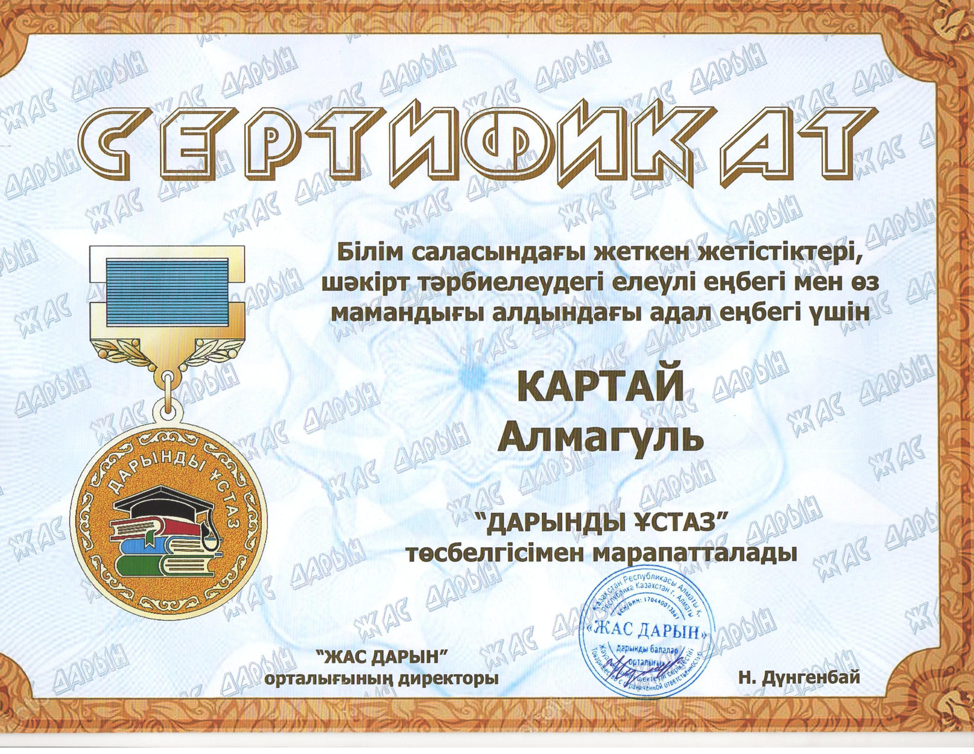 Білім саласындағы жеткен жетістіктері, шәкірттерін білім нәрімен сусындатып, жақсы қасиеттерді бойына дарытып, адамгершілік рухта бағыт- бағдар беруде сіңірген еңбегі үшін республикалық «ЖАС ДАРЫН» дарынды балалар орталығының арнайы алғыс хатымен марапатталды.