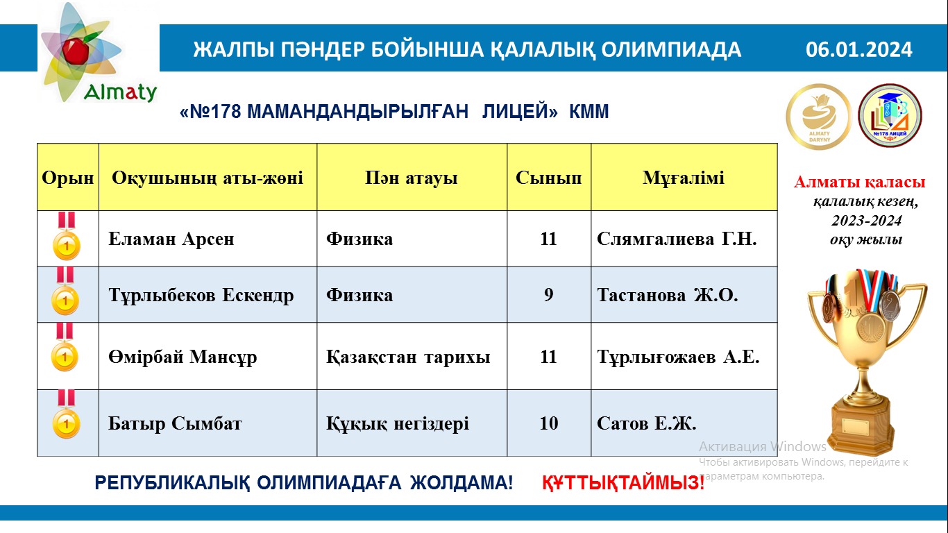 2024 жылдың алғашқы БАЙҚАУЫ 4-6 қаңтар аралығында жалпы білім беретін пәндер бойынша ресубликалық олимпиаданың ҚАЛАЛЫҚ кезеңі өтті. Олимпиада қорытындысы бойынша лицейден 50 оқушы қатысып, 4 оқушы І орын, 4 оқушы ІІ орын, 14 оқушы ІІІ орын, 6 оқушы грамота иеленіп, барлығы 22 оқушы жеңімпаз және жүлдегер атанды. Баршаларыңызды құттықтаймыз!!!
