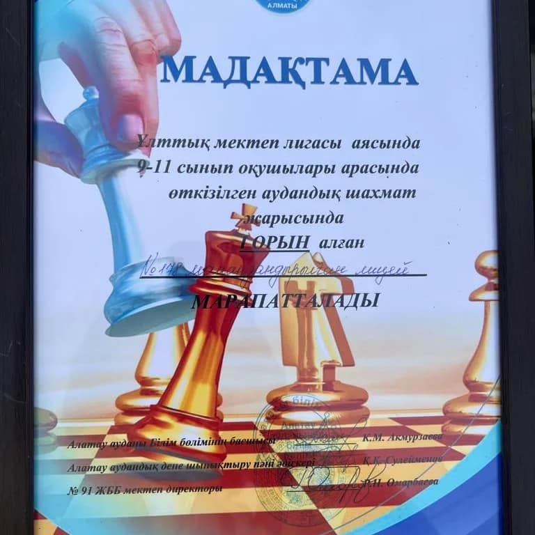 Шахмат — ақыл ой мен қырағылықты қатар қажет ететін интеллектуалды ойын. Шахмат — логикалық ой-өрісті дамытатын, әлемдегі ең танымал спорт түрлерінің бірі. Онымен айналысатын кез келген адам әр қадамын аңдап, есеппен басуға дағдыланады. Демек, бұл спорт біздің бүлдіршіндеріміздің де жан-жақты дамуына ықпал етеді. Жарыс соңында жеңімпаздар анықталып, мақтау қағаздарымен марапатталды. Нәтижесінде: №178 мамандандырылған лицей командасы 1-орынды қанжығаларына байлап, қалаға жолдама алды. Жеңімпаз оқушыларымызды жеңістерімен құттықтаймыз! Алдағы уақытта болатын қалалық жарыста жеңіс, сәттілік тілейміз!