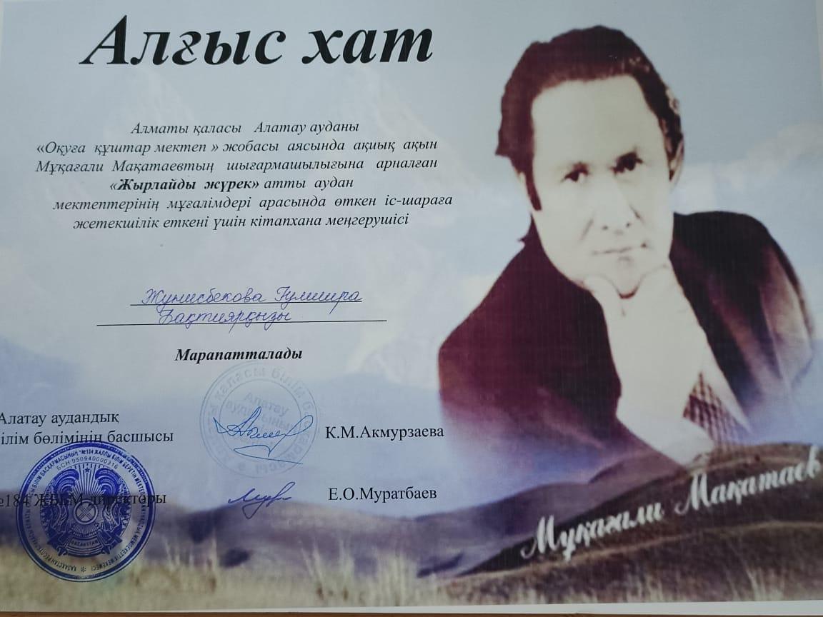 Алматы қаласы Алатау ауданы "Оқуға құштар мектеп" жобасы аясында ақиық ақын Мұқағали Мақатаевтың шығармашылығына арналған "Жырлайды жүрек" атты аудан мектептерінің мұғалімдері арасында кітапханашылардың ұйымдастыруымен өткен мәнерлеп оқу байқауына қатысып, "Есіңе мені алғайсың" атты ақын өлеңіне жазылған әндер номинациясы бойынша №178 мамандандырылған лицейдің математика пәнінің мұғалімі Әділбеков Ермұрат II орын иеленді. Кітапханашы: Жунисбекова Г.Б.