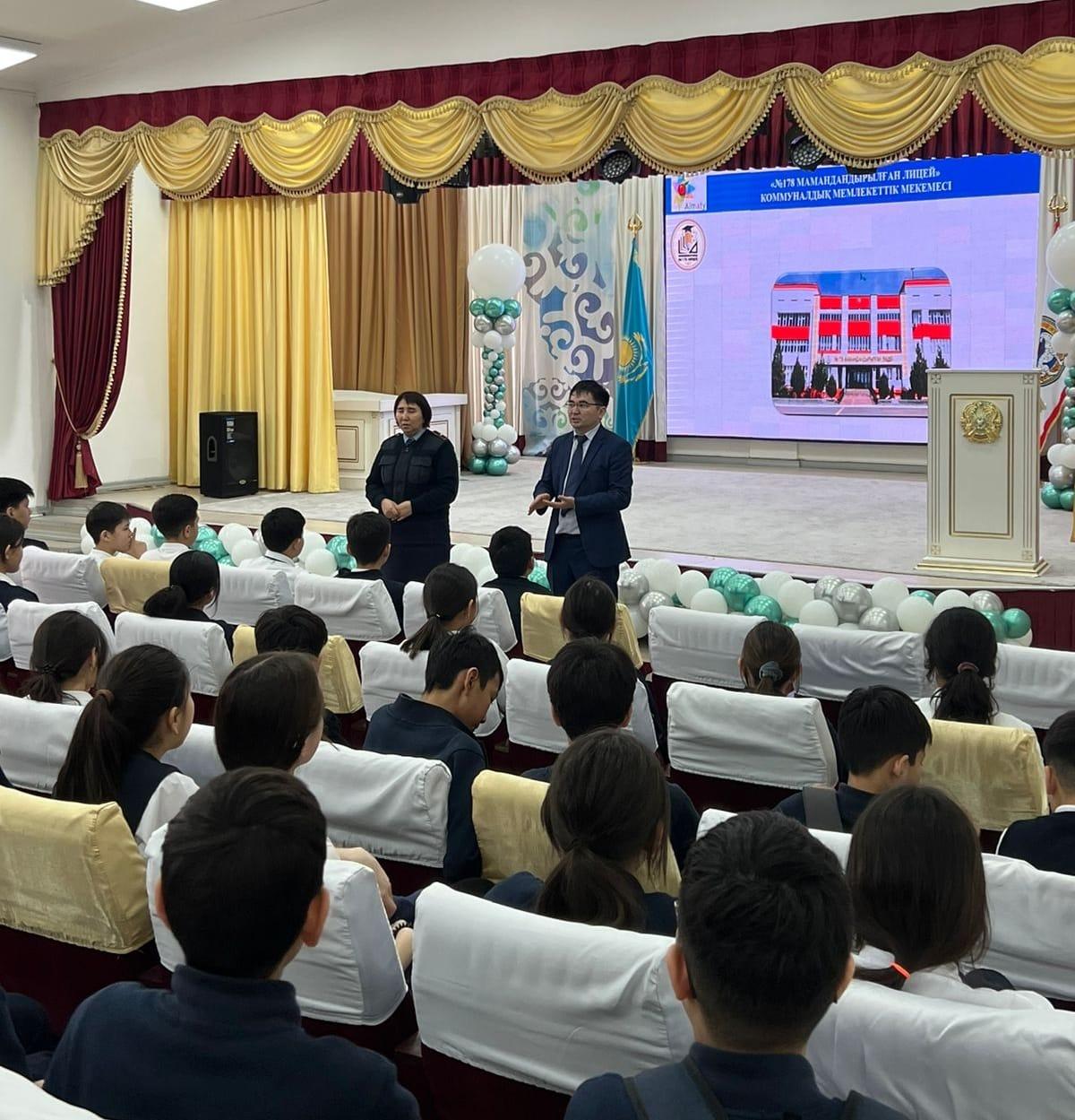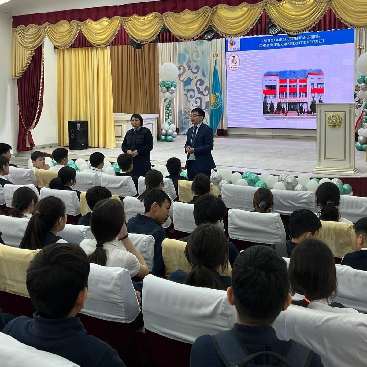 №178 мамандандырылған лицейде директордың тәрбие ісі жөніндегі орынбасары Б.Н.Кутумов, Алатау АПБ ЖПҚБ ЮПБ инспекторы полиция майоры Л.Т.Жампеисова "Құқықбұзушылықтың алдын алу" тақырыбында 7-сынып оқушыларына түсіндірме жұмыстарын жүргізді.