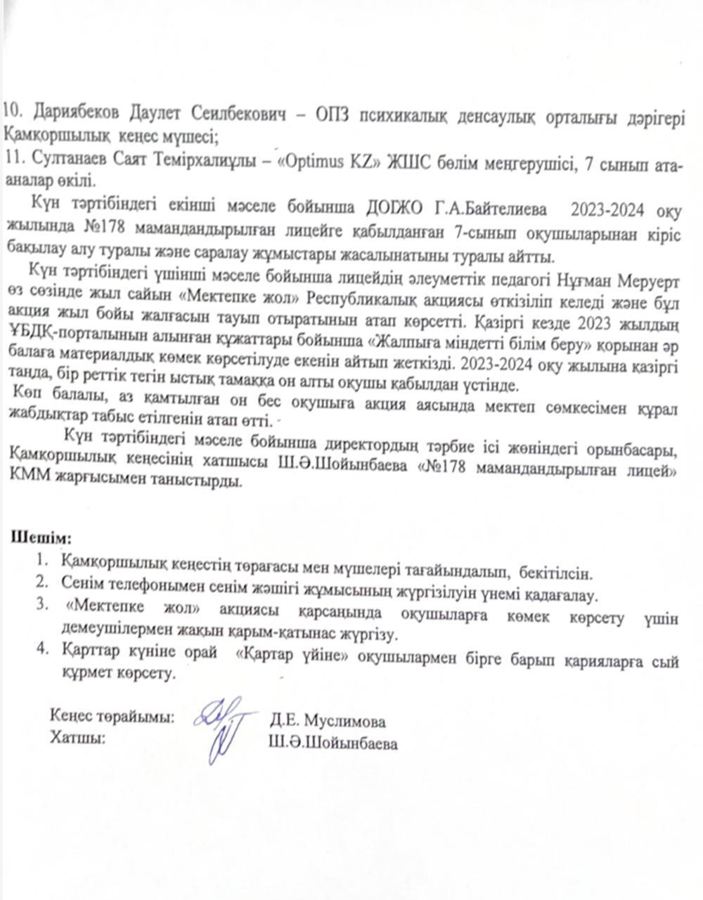 №1 Қамқоршылық кеңесте қаралған мәселелер: 1. 2023-2024 оқу жылында №178 мамандандырылған лицейдің ата-аналар құрамынан қамқоршылық кеңес мүшелерін жаңадан сайлау және бекіту;