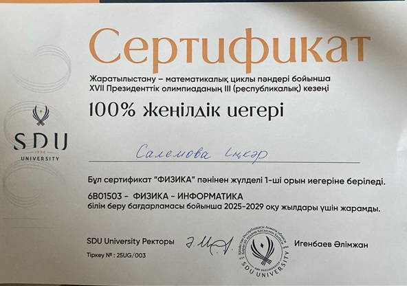 🥉 дәрежелі диплом және Сүлеймен Демирель атындағы университеттің (SDU) 100% білім грантына 11 “Б” сынып оқушысы Салемова Іңкәр ие болды.