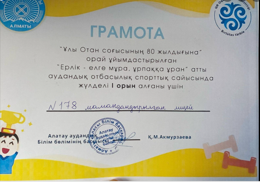 Ұлы Жеңістің 80 жылдығына орай ұйымдастырылған "Ерлік – елге мұра, ұрпаққа ұран" атты аудандық отбасылық спорттық сайысында лицейіміздің 5 "Г" сыныбының ата-анасы, "Нұртай" әулеті жеңімпаз атанып, арнайы грамотаға ие болды.